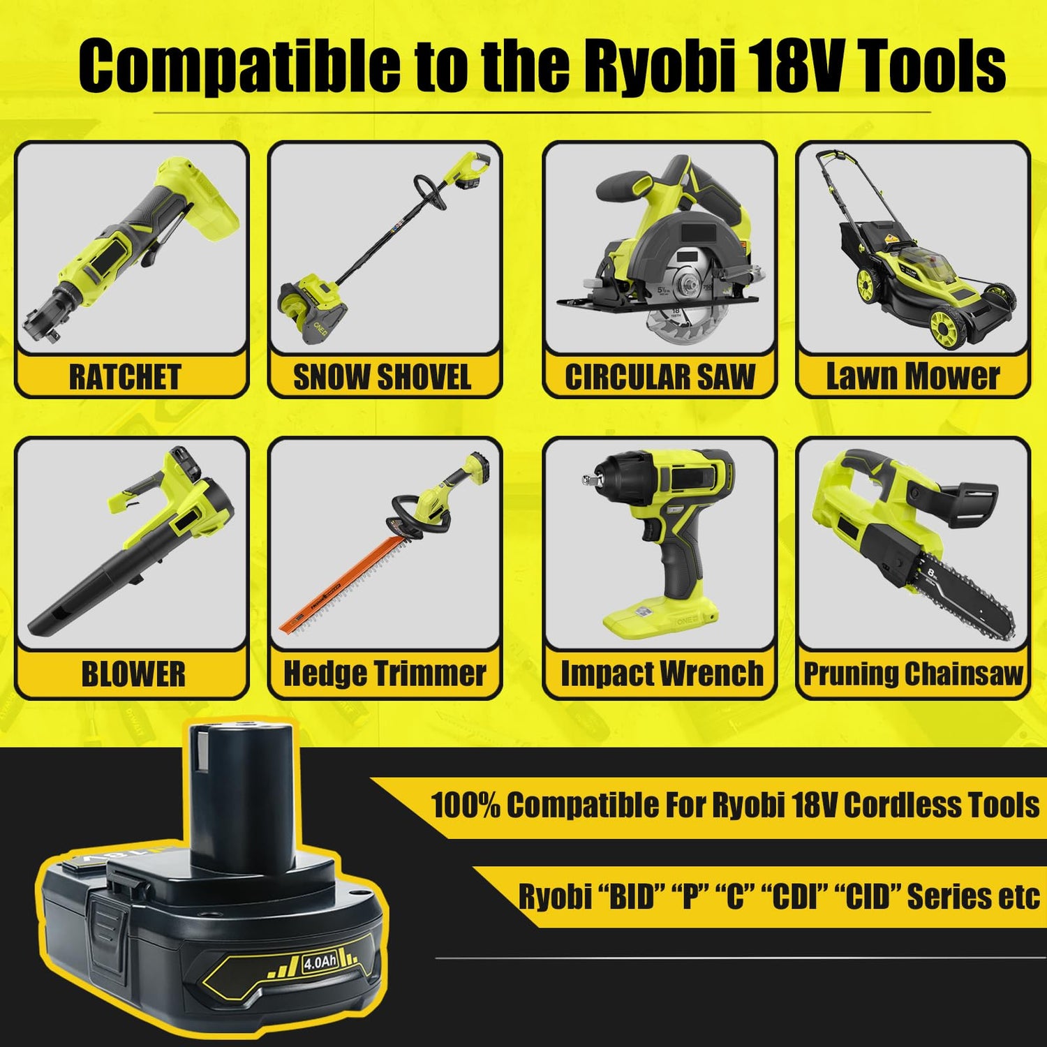 - ✅ [High Capacity] 4.0Ah 18V one battery Replacement for Ryobi p108 Not only improving capacity, but also the performance. Compare to the original Ni-Cd/Ni-MH 3.0Ah battery,it has no memory effects and running time longer than the Ni-Cd/Ni-MH battery. More powerful and More efficient