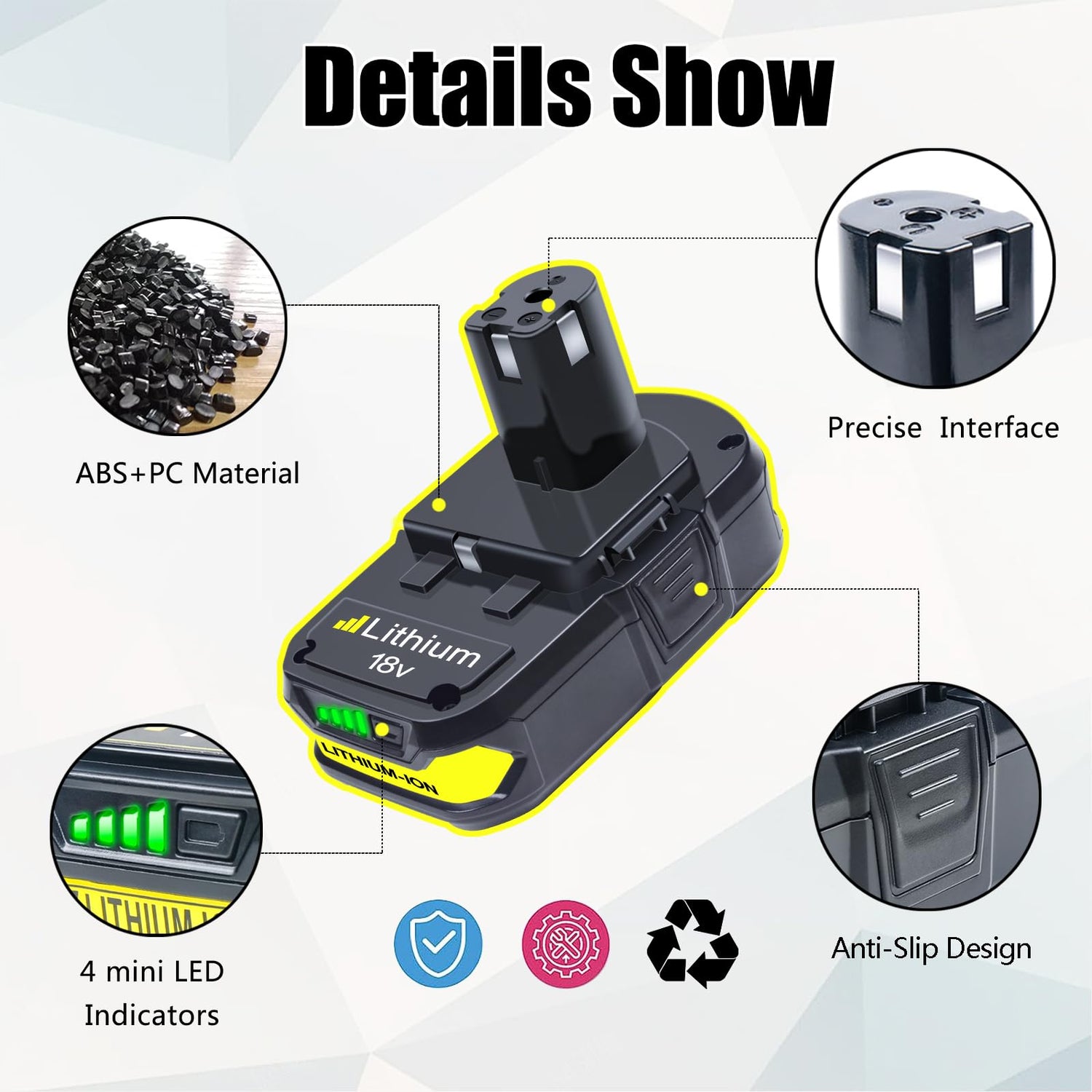 - ✅ [Safety & Reliable] The 18v lithium battery Replacement for Ryobi built in protection against potential damage caused by overcharging, overheating and short-circuit protection. Please Note: it will stop sending out power or charging if it's too hot, you should wait for cooling down