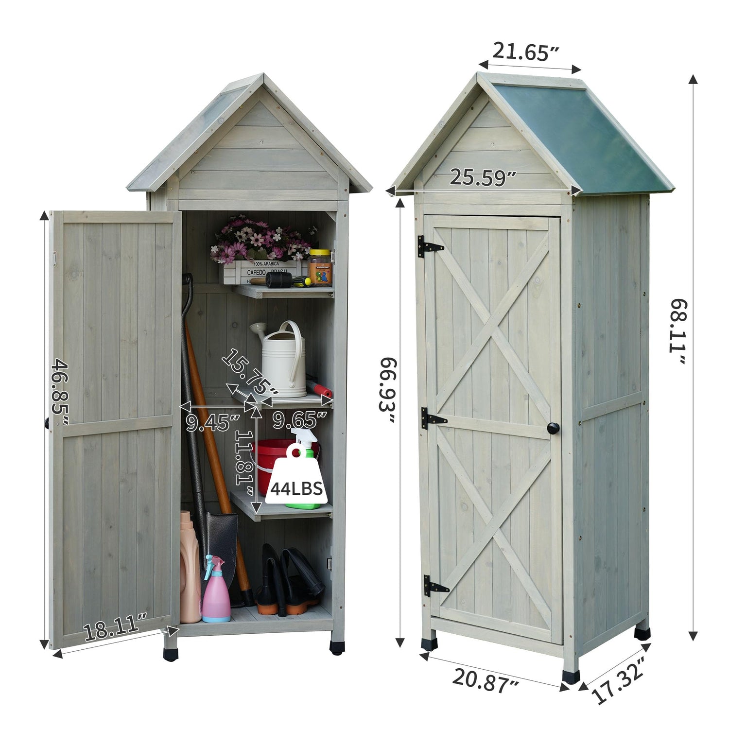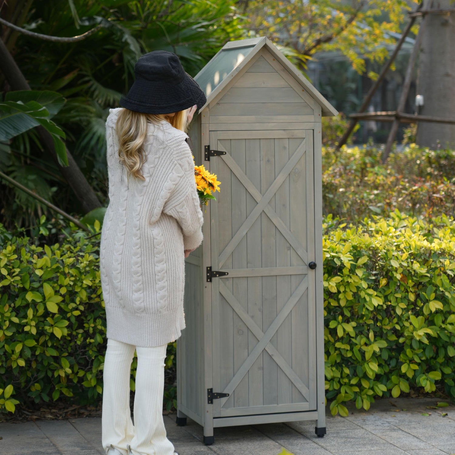 • Multifunctional Use:Whether used as a garden shed,patio storage shed,deck storage cabinet,or tool closet,its multiple-use design adapts to different storage needs,providing a convenient and organized space for your gardening and household essentials