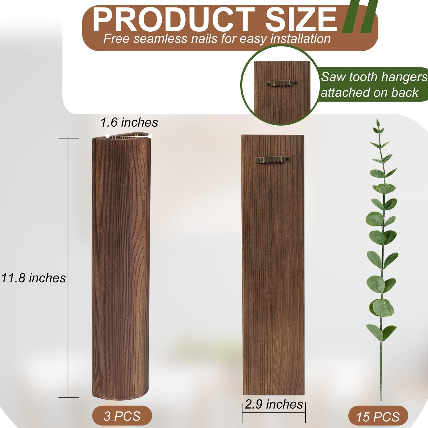 - Ideal Size & Easy Hanging:Our wooden wall planter with 20 artificial eucalyptus in a rich, lifelike green color, has a farmhouse style and ideal size, perfect for dried flowers and greenery. Each wooden wall vase measures 11.8" tall, 2.8" wide, 1.6" deep, and comes with a serrated hook on the back for easy hanging on wall or standing on a table