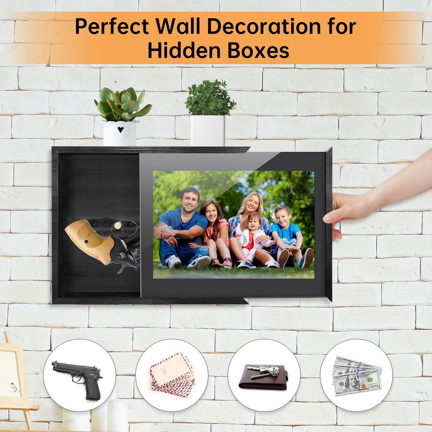 - HIDDEN PISTOL GUN STORAGE BOX: This hidden gun storage wall decor is made of solid wood, chalkboard, and acrylic. Pulling the gun cabinet divider to the right opens up a secret space for storing handguns, letters, cash, etc.