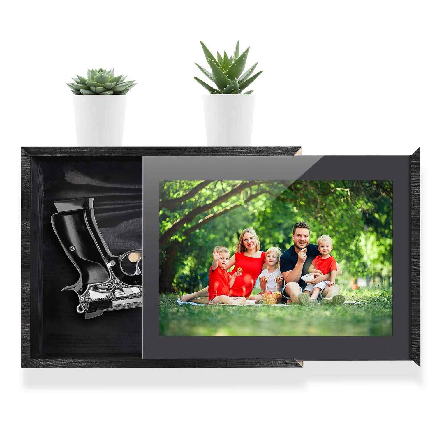 - WALL DECORATION CONCEALMENT SHELF: Using the size (14 x 11 inches) and style of a picture frame, you can nicely decorate the interior of your home. Allows you to add a favorite photo or picture to bring more meaning. Natural elegance when closing the gun concealment box, a good hiding place for handguns. Suitable for indoor bedroom living room hallway, etc.