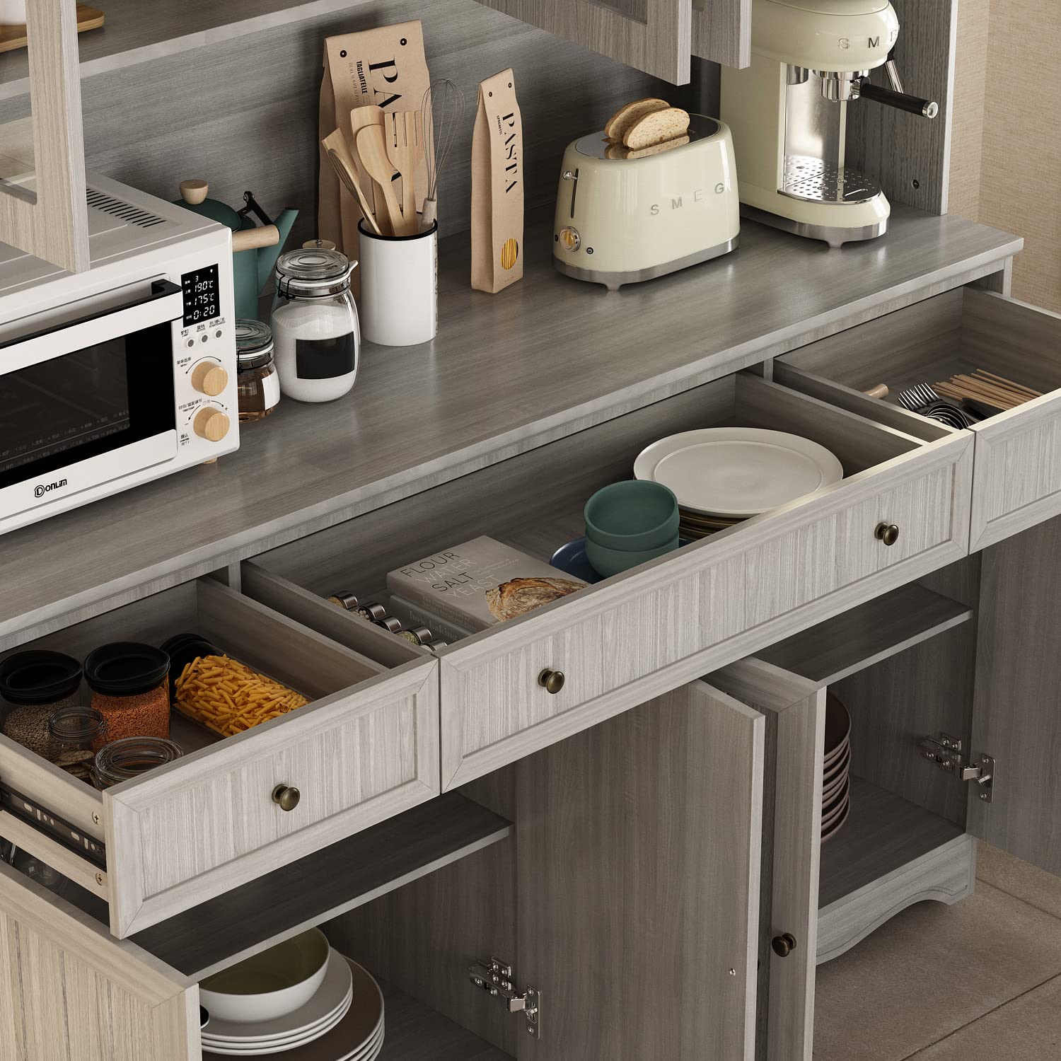 - 【Large Storage Space】This large size kitchen hutch offers open surface more than sufficient to place you cooking machiens,like microwave, toaster, blender or coffee makers. Shelves behind glass doors are roomy for tableware, dinnerware, glassware or anything else you like