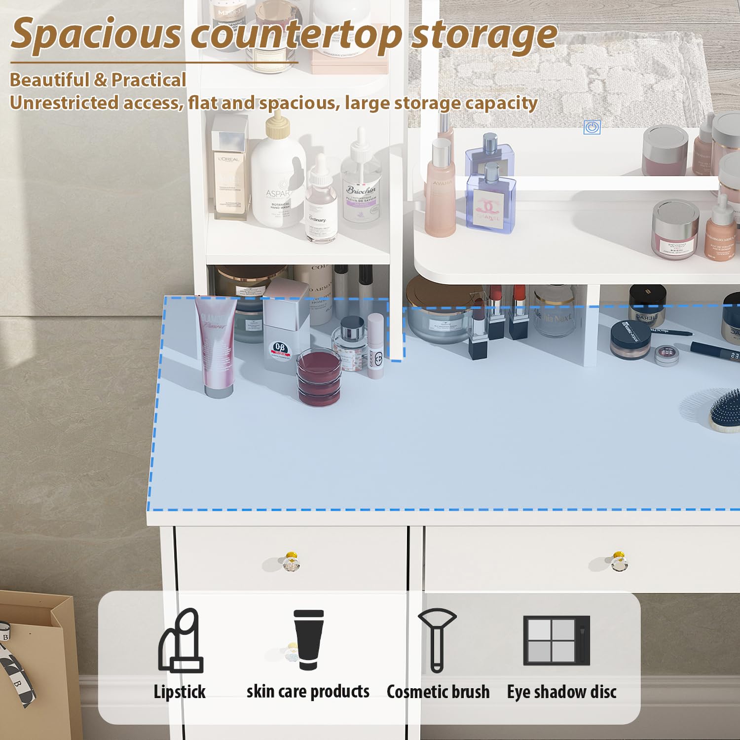 - ADEQUATE STORAGE CAPACITY - drawers and shelves on the desktop provide you with plenty of storage space. The large storage space allows you to put all your skin care products, cosmetics, jewellery and other beauty supplies