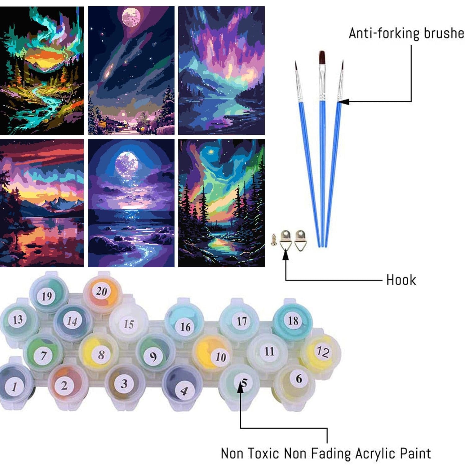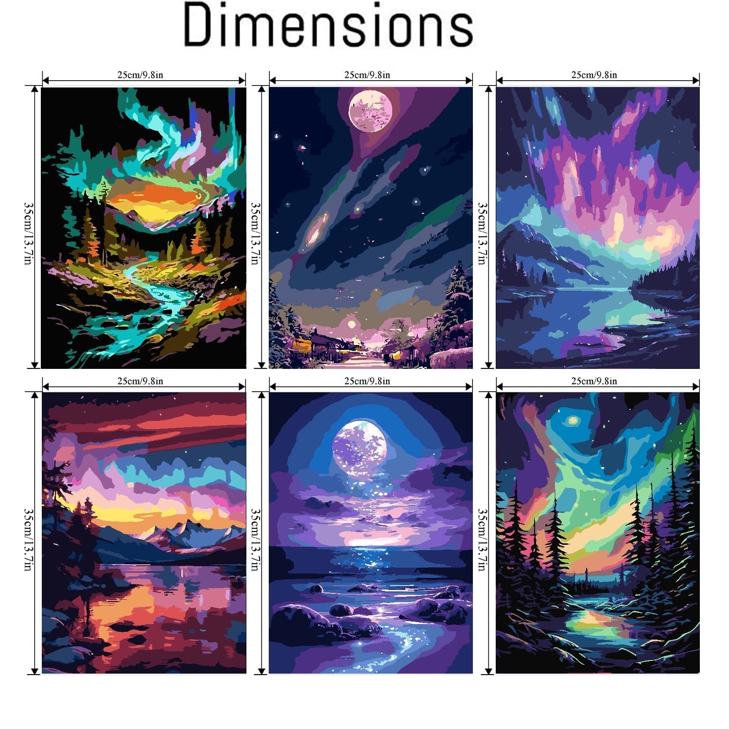 Fuinkqe 6 Pack Paint by Number Kit for Adults Beginner, Polar Lights Moon Landscape DIY Acrylic Painting Paint by Numbers Kits on Canvas for Gift Home Wall Decor 10x14inch