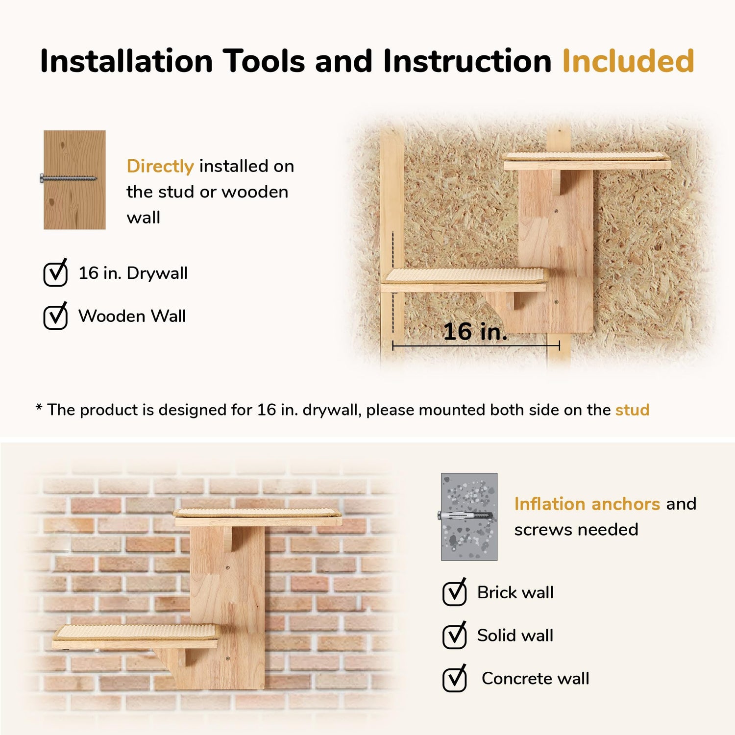 - STABLE AND SAFE - The cat shelf is suitable for 16 Inch drywall. Most homes use 16 inch wide wood studs, mounting both sides of the product on the studs will significantly increase stability. Moreover, the cat climbing shelves passed loading test, fat cats can freely nap, scratch, and climb on it without worry about falling down.