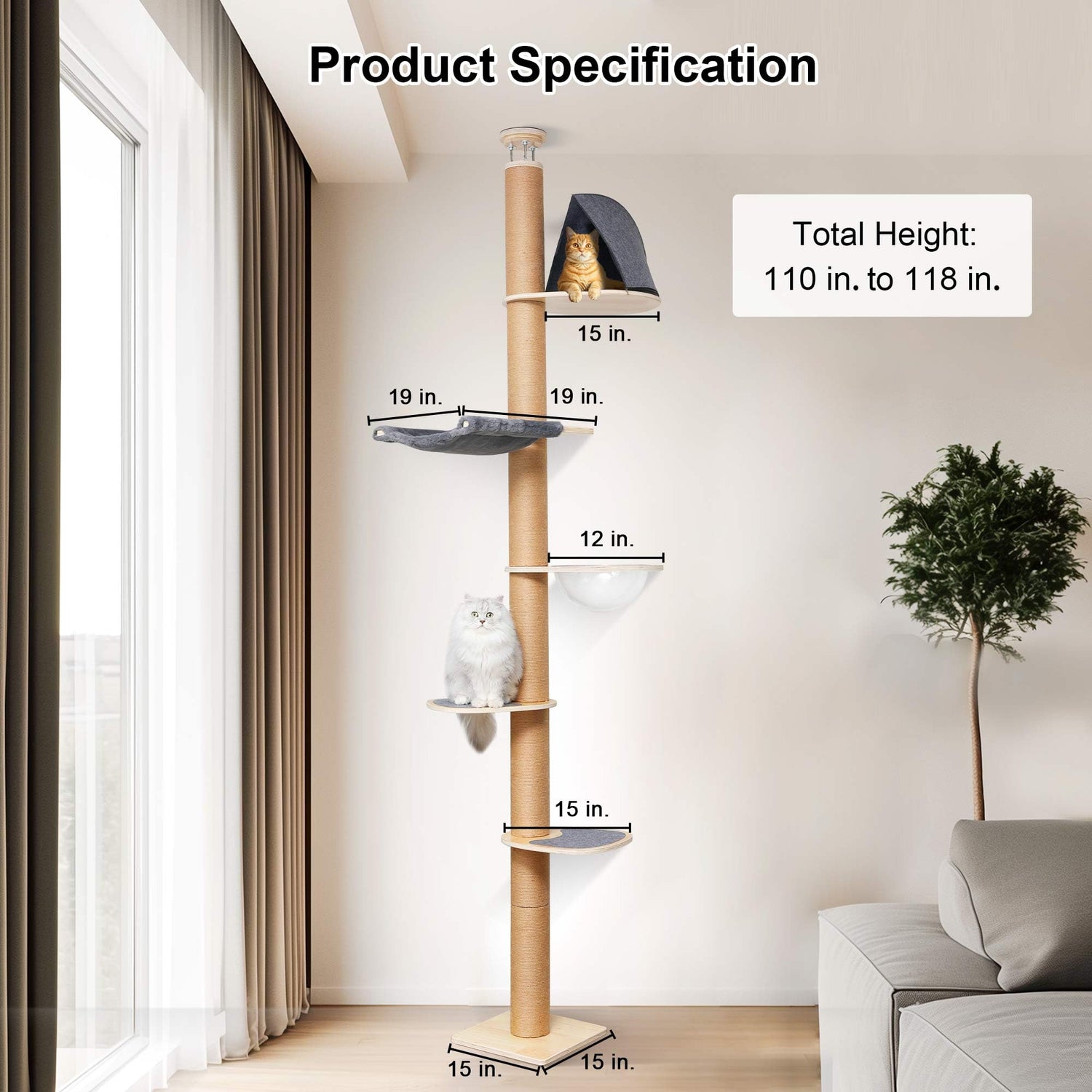 FUKUMARU Floor to Ceiling Cat Tree, 6 Level Adjustable Height (5.7-9.8 ft) Climbing Tower with Thickened Scratching Posts, Cat Activity Center with Transparent Capsule and Cozy Hammock