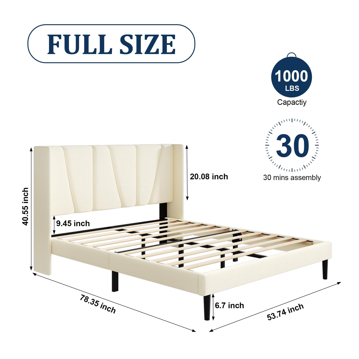 Full Bed Frame with Headboard and Wingback, Velvet Upholstered Platform Bed, Mattress Foundation with Wooden Slat Support, No Box Spring Needed, Easy Assembly, Noise Free, Beige