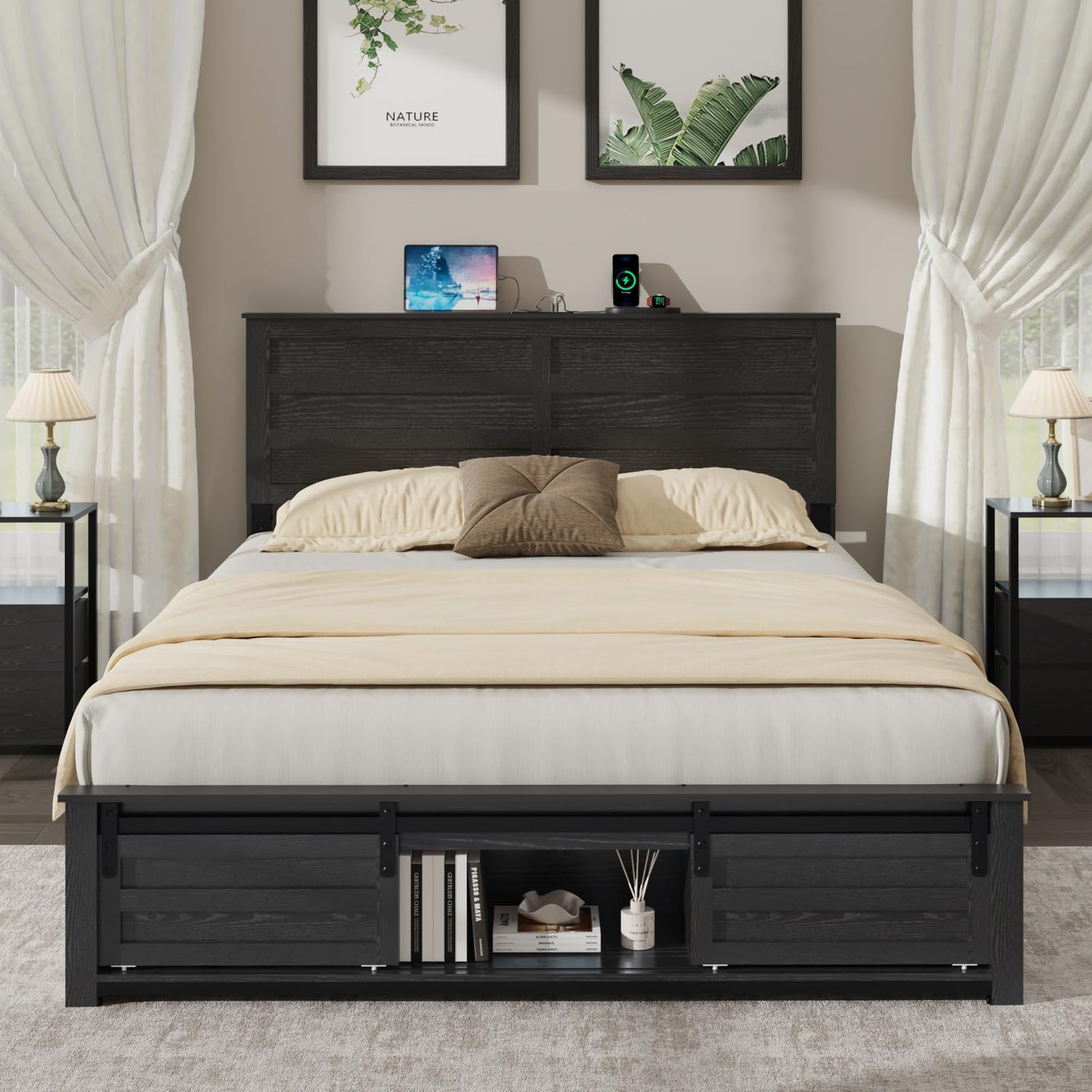 Full Bed Frame with Storage Headboard, Metal Platform Bed Frame with 3 Storage Compartments, Built-in Charging Station and LED Lights, No Box Spring Required, Noiseless, Easy Assembly,Antique Black