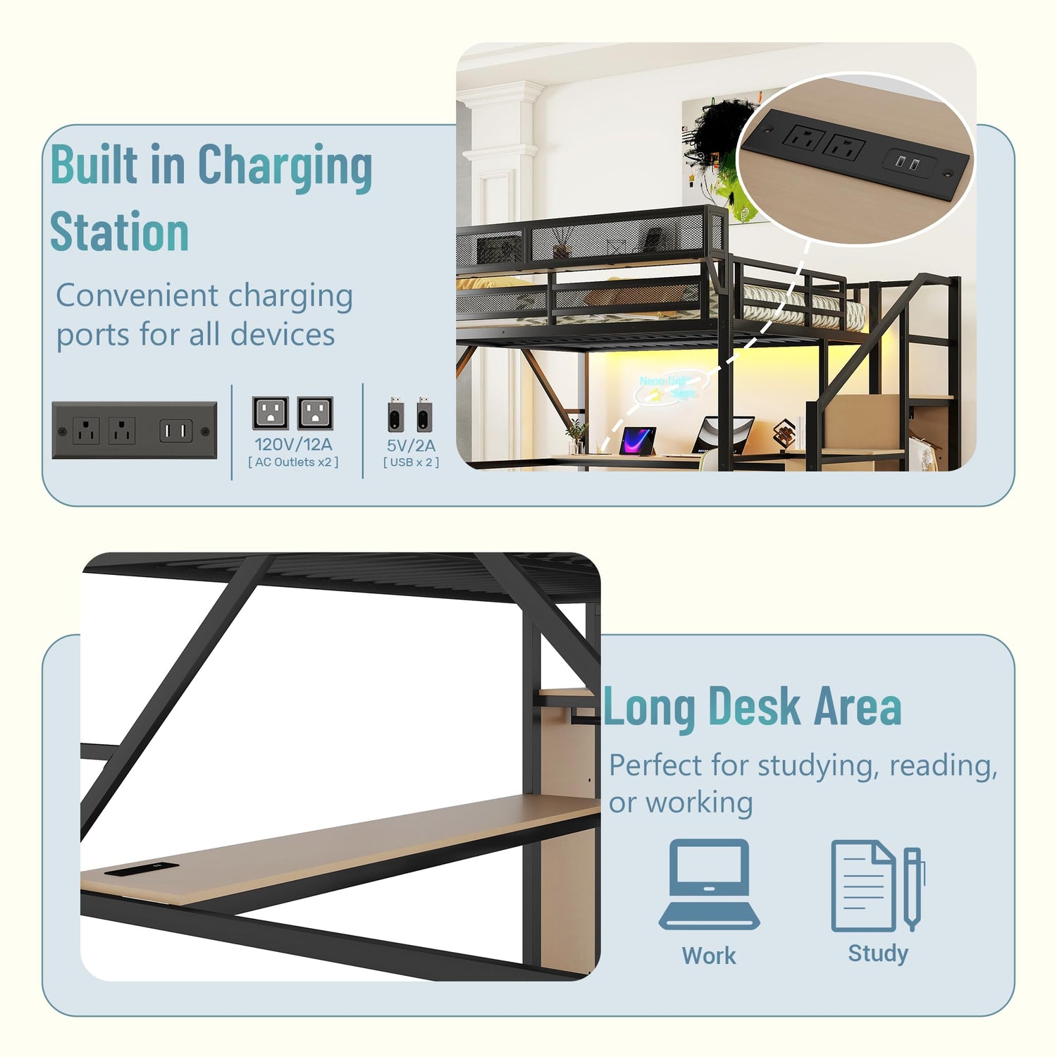 - 【Loft Bed with Desk & Charging Station】 Maximize your room’s potential! Our full-size loft bed combines a spacious desk (54" under-bed clearance) and a built-in charging station (2 USB ports + 2 outlets) to create a multifunctional zone for work, gaming, or study—perfect for small apartments, dorms, or kids’ rooms.