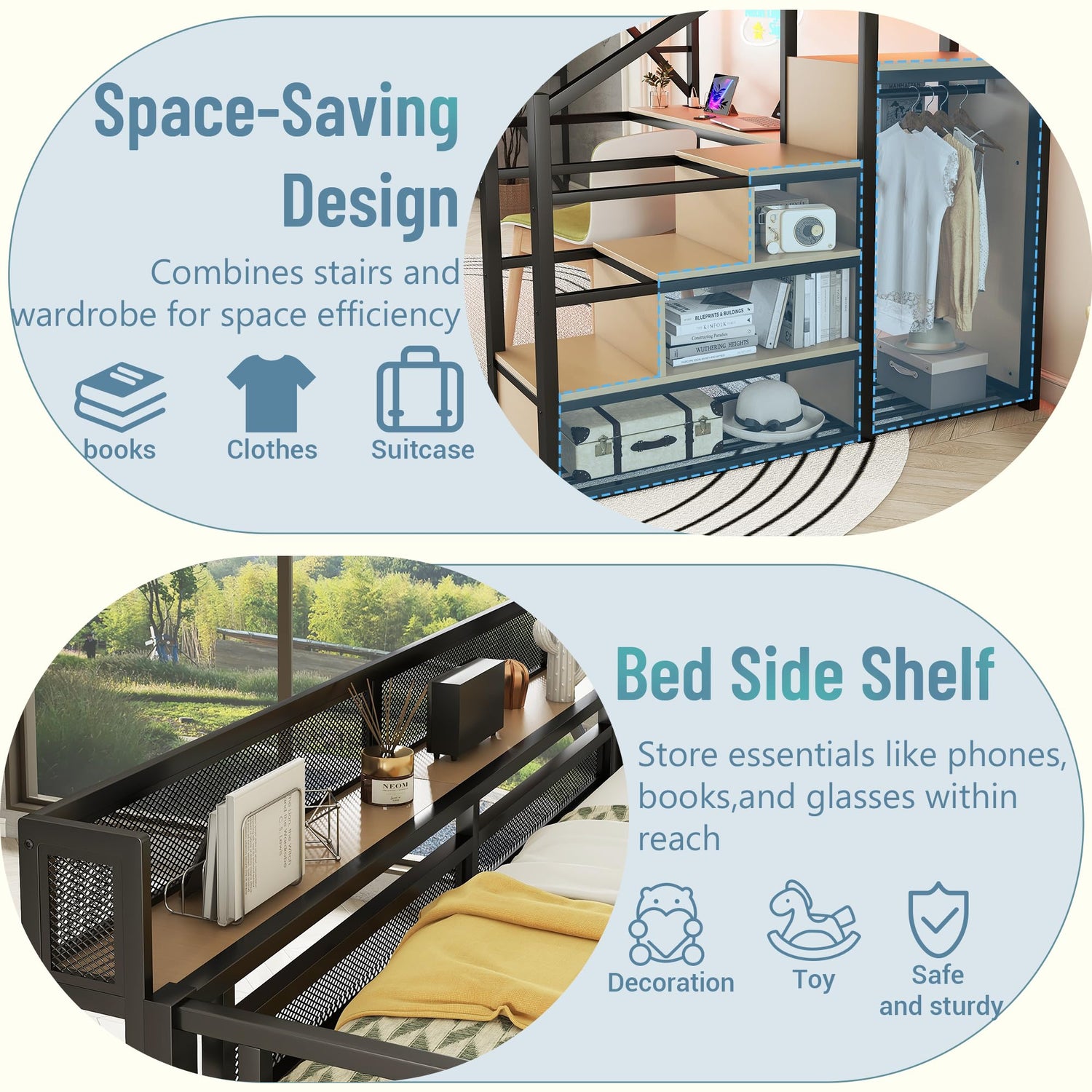 - 【Loft Bed with Storage and Stairs】:The heavy-duty loft system combines full bed and four-step stairs shelves and a compact wardrobe all in one furniture piece. Sleek and space-saving design adds a touch of elegance to any bedroom. Ideal for any living environments, like children’s bedrooms, universities, residential treatment facilities, and bunkhouses.