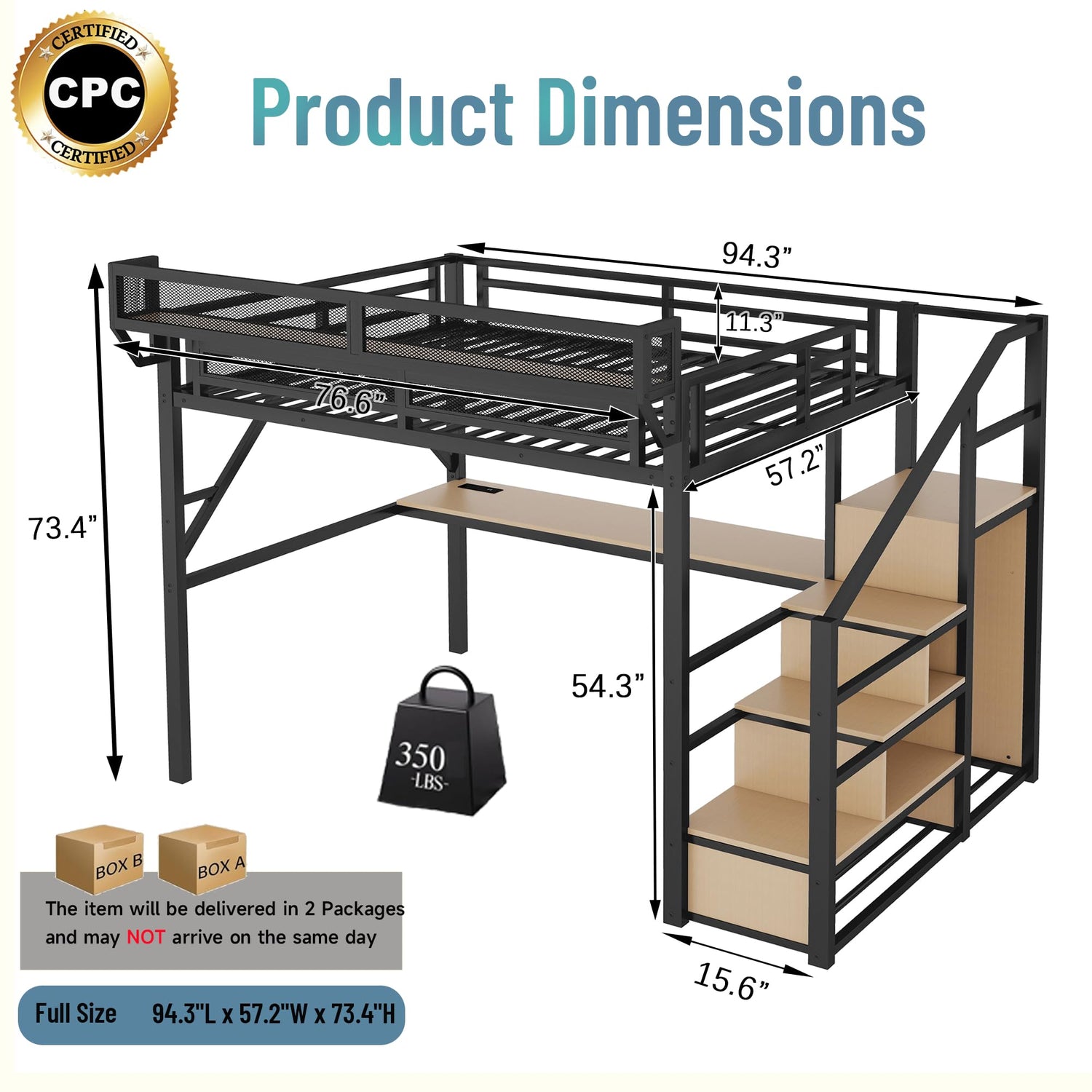 - 【Standard Full Bed Dimensions】: Loft Bed - 94.3''L x57.2''W x 73.4''H; Mattress not included. Our full size loft bed comes with detailed instructions and numbered parts, so that it can be assembled step by step conveniently. Note: This metal loft bed will be came in 2 boxes. Please wait patiently for both boxes delivered before assembly. if extra help is needed, don’t hesitate to contact our friendly customer service representatives.