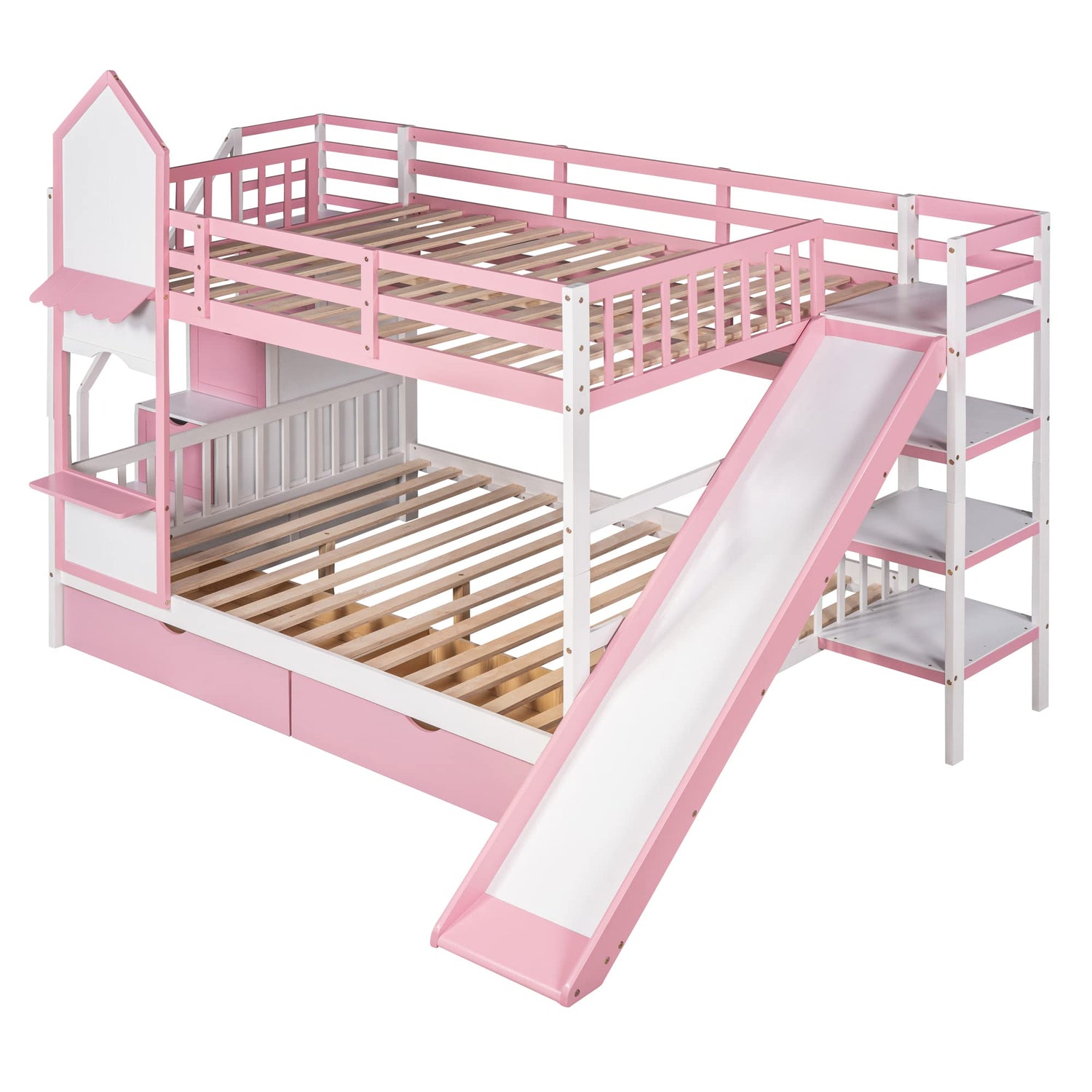 Full-Over-Full Bunk Bed, Castle Style Bunk Bed with 2 Drawers and 3 Shelves, Solid Wood Bunk Beds with Slide and Storage Staircase, Playhouse Low Bunk Bed for Kids Teens Boys Girls (Pink-O273)