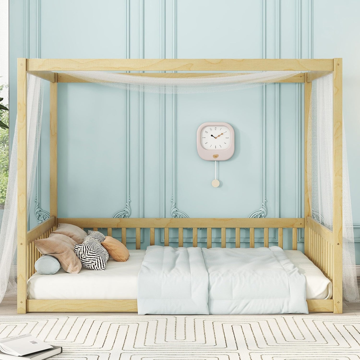 Full-Size Natural Canopy Bed Frame with Guardrails for Kids – Montessori Floor Bed Design