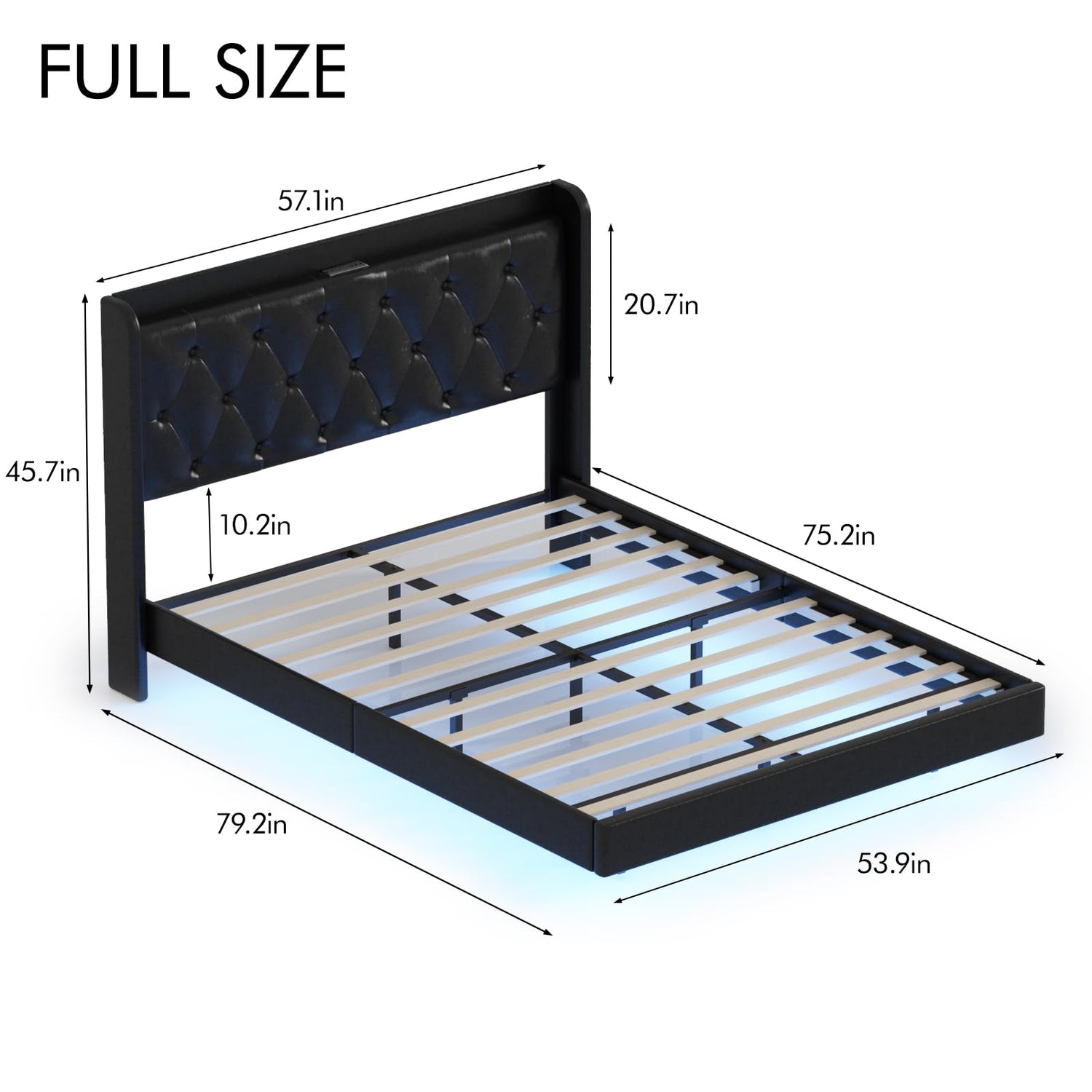 Full Size Floating Bed Frame with LED Lights, Upholstered PU Leather Platform Bed with Charging Station & Button Tufted Headboard Storage, No Box Spring Needed, Black