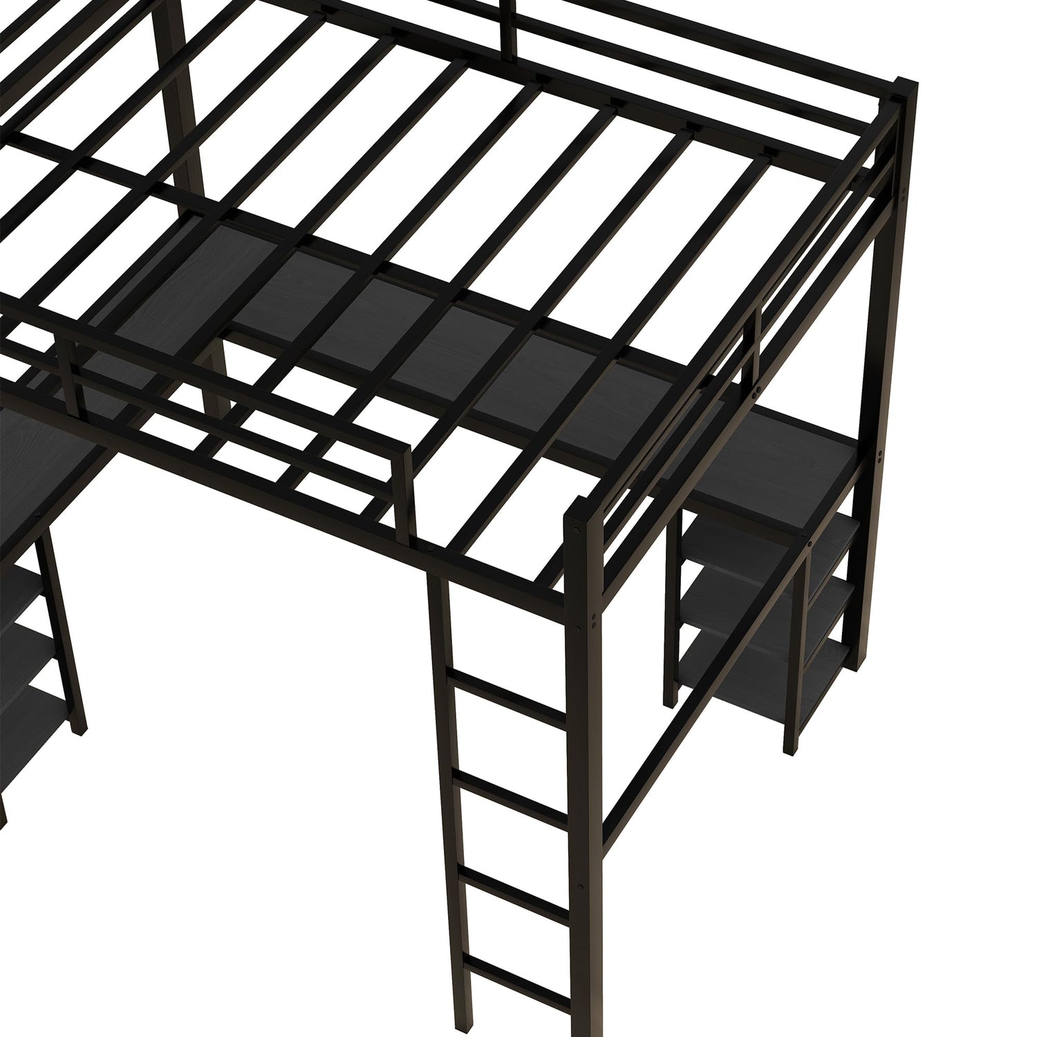 Full Size Loft Bed with Desk and Storage Shelves, Heavy Duty Metal Loft Bed with Black Desk and Guardrail, Full Size Loft Bed for Kids, Teens(Full Black Desk)