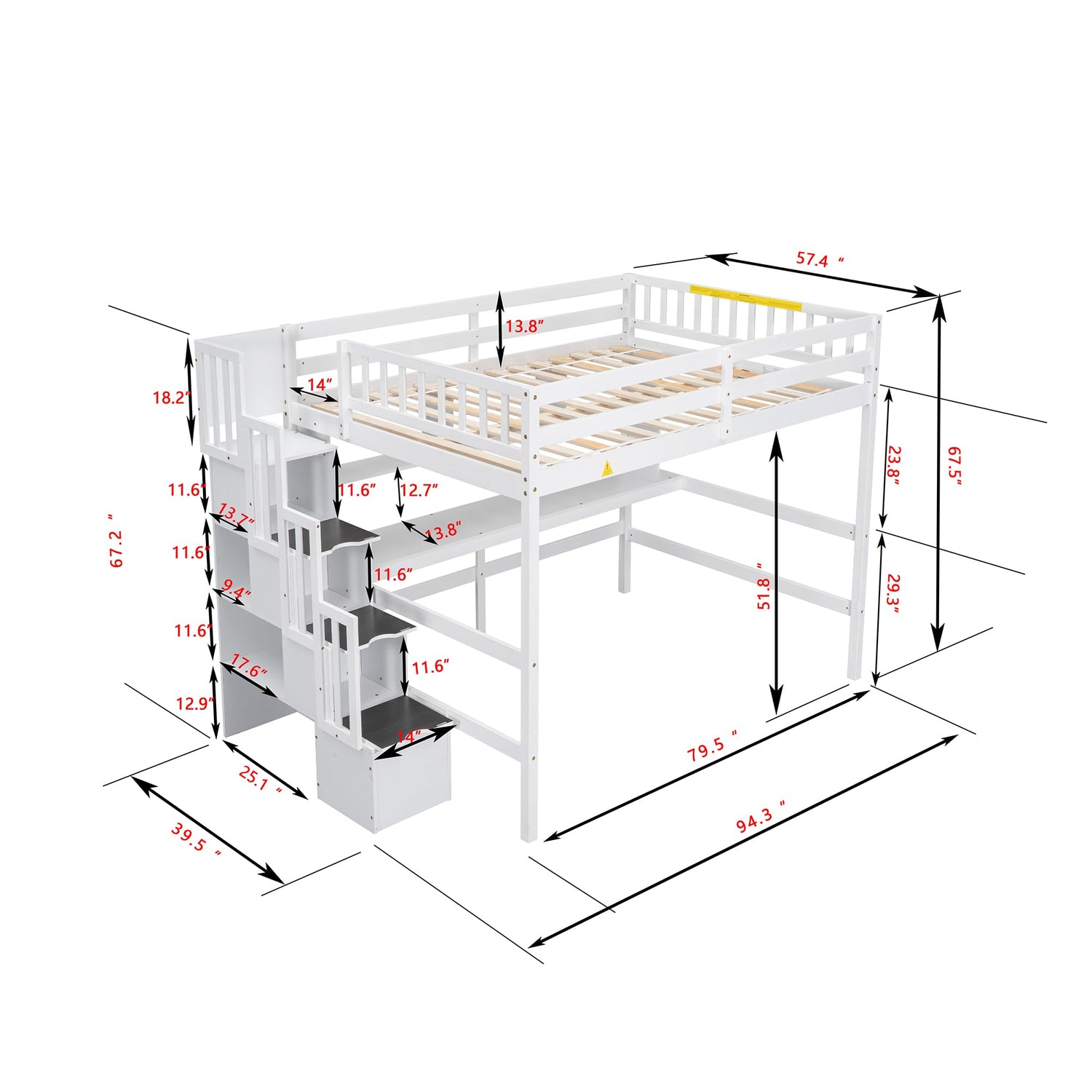 - đ„ăSafe for KidsăThe staircase is designed with a safe and wider width to provide more spacious steps and solid support,making it easier for kids to get in and out the loft bed full size.The full-length guardrail can protect children sleep safety.Weight Capacity:250lb.