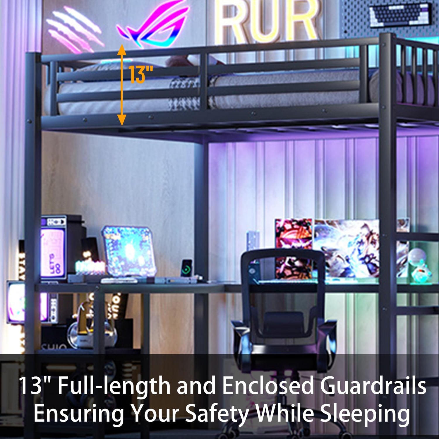 - 【LED Loft Bed with USB Port and Outlets】The RGB LED lights on the back of the full size loft bed make the metal loft bed useful and unique. With 16 color options, easily adjust brightness and color with a remote control. This full loft bed designed with a charging station in corner of the desk(include USB ports and 2 outlets).