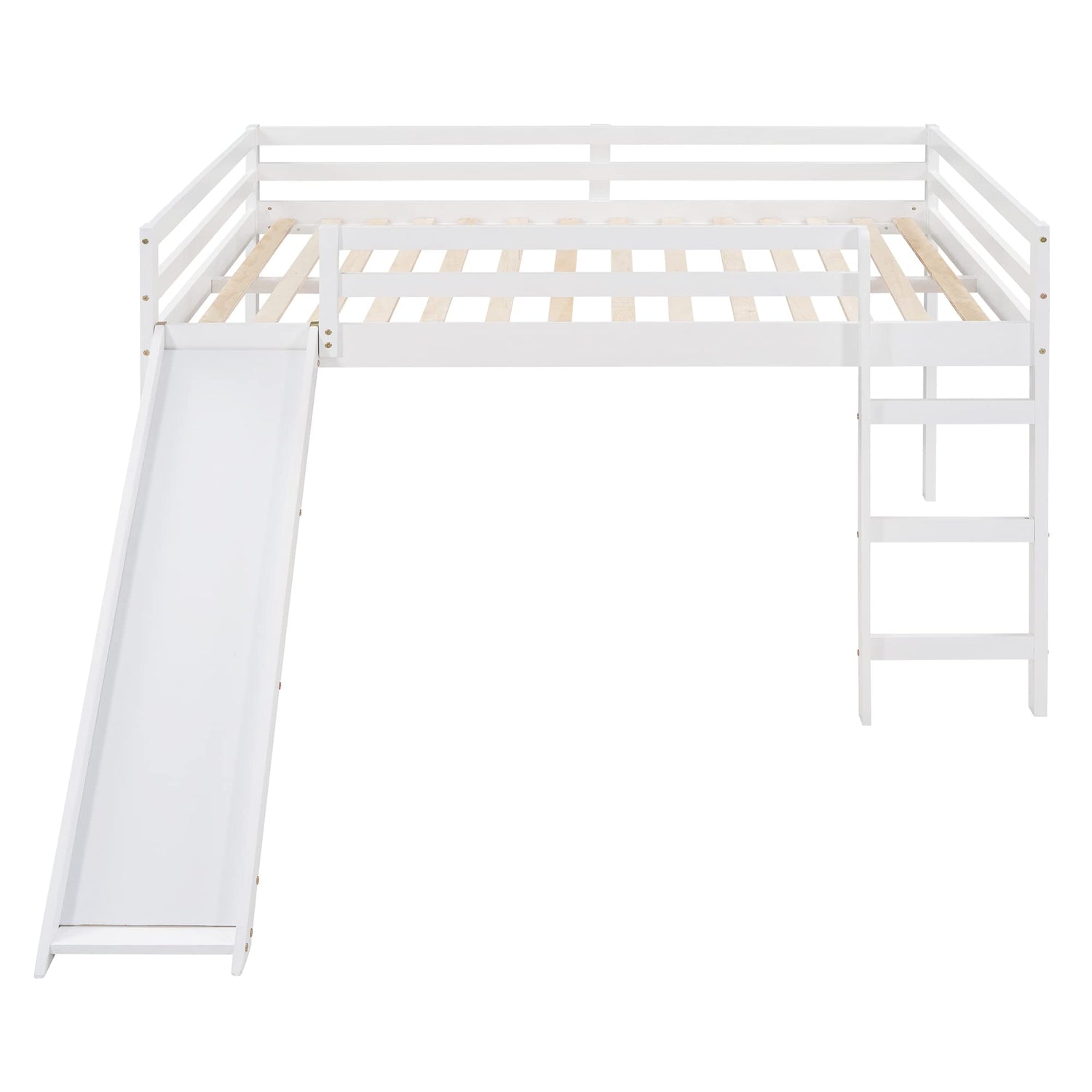 Full Size Loft Bed with Slide, Low Loft Bed with Ladder & Safety Rail, Wooden Full Loft Bed Frame for Kids Teens Girls & Boys, No Box Spring Needed, Easy Assemble (Full, White)