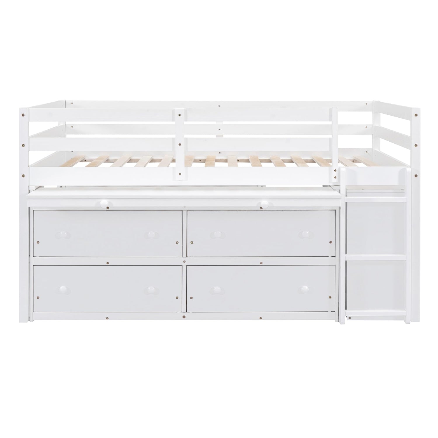 Full size Low Loft Bed with Storage, Full Size Loft Bed with Portable Desk & 4 Drawers, Wood Full Loft Bed Frame with Shelves, Modern Farmhouse Junior Loft Bed for Kids Boys Girls, White