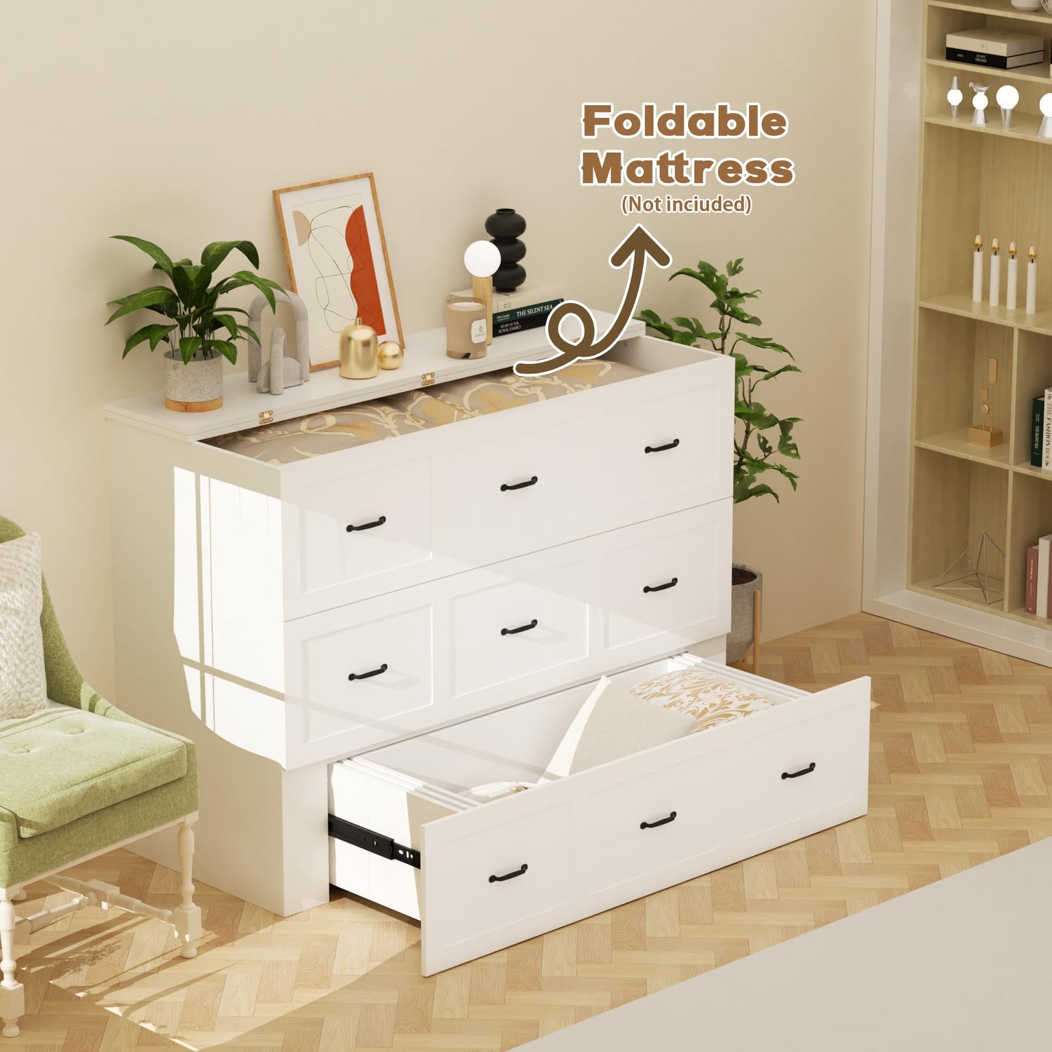 - Space-Saving Murphy Design:The full-size Murphy bed is equipped with a spacious bottom drawer with a large capacity, providing additional space for storing pillows, bedding, books, clothes, and more. In addition, the hidden internal storage area inside the cabinet is perfect for neatly hiding foldable mattresses, helping to keep the bedroom tidy and the space organized. The product does not include a mattress and requires additional purchase.