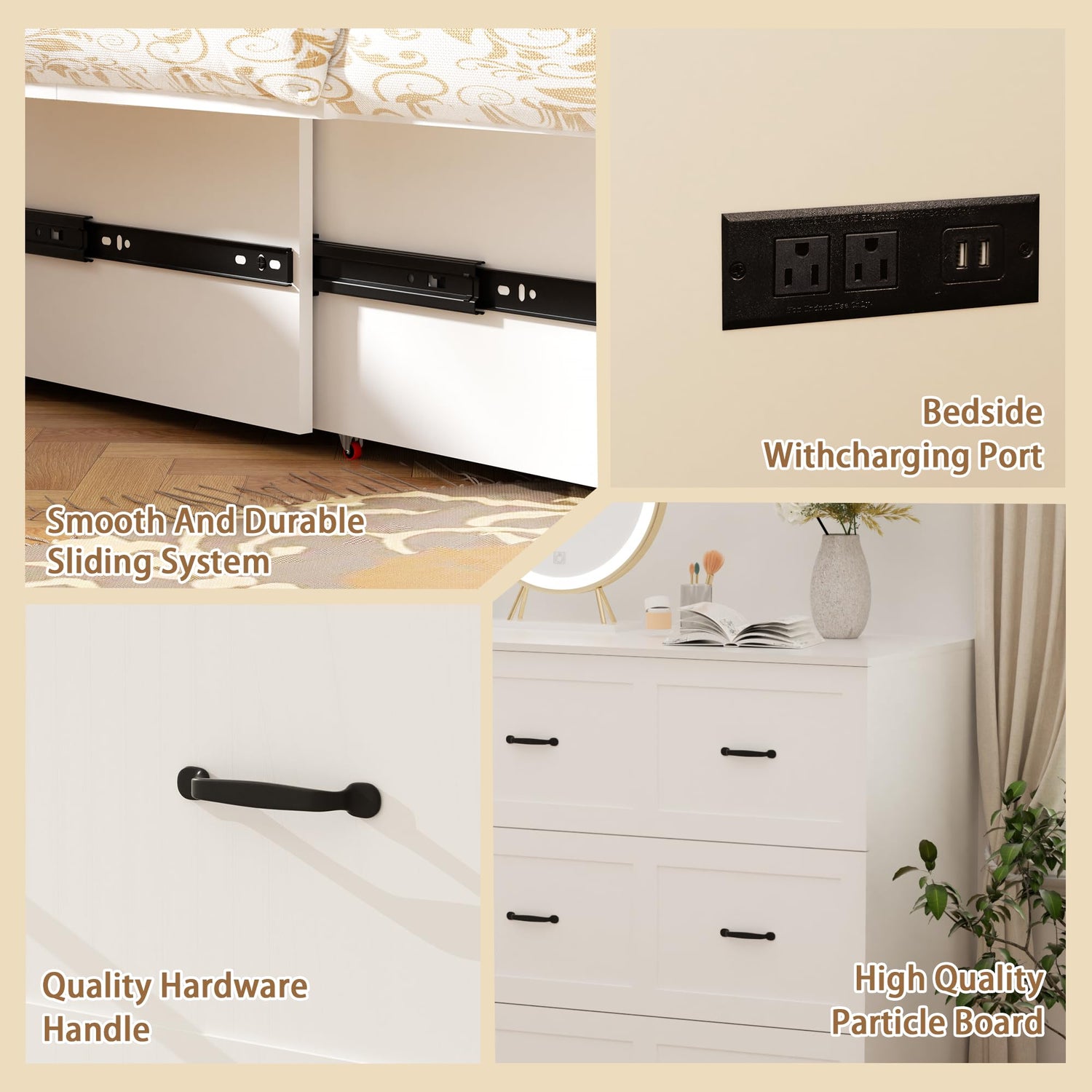 Full Size Murphy Bed with Charging Station and Drawer Farmhouse Cabinet Bed Wood Space-Saving Hidden Folding Platform Bed Chest for Home Office Bedroom Guest Room Apartment,White