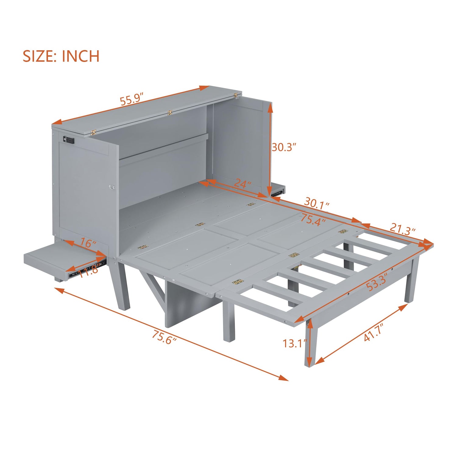 Full Size Murphy Bed with USB Port and Removable Shelves Solid Wood Foldable Bed Frame Full for Bed Room, No Box Spring Needed (Grey)