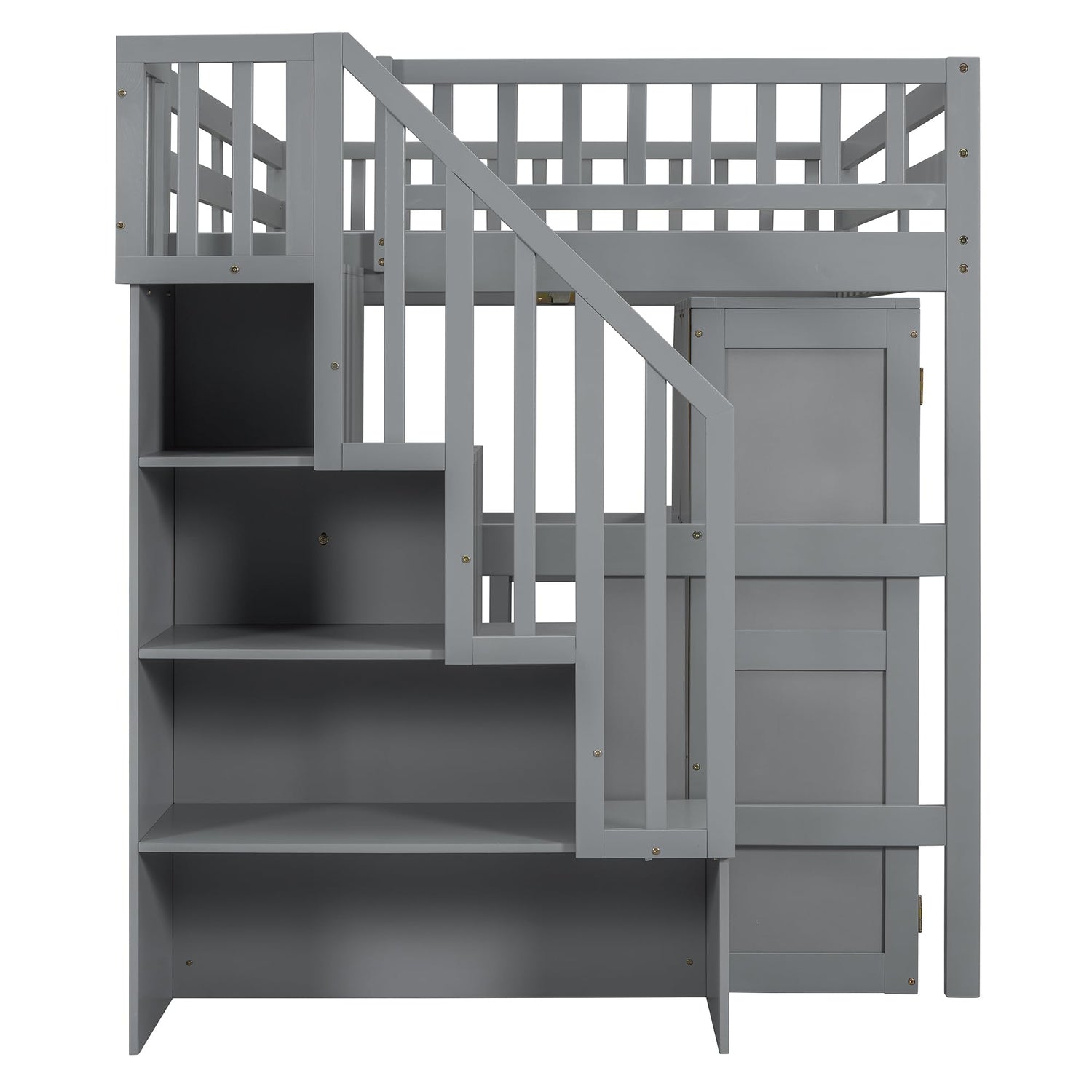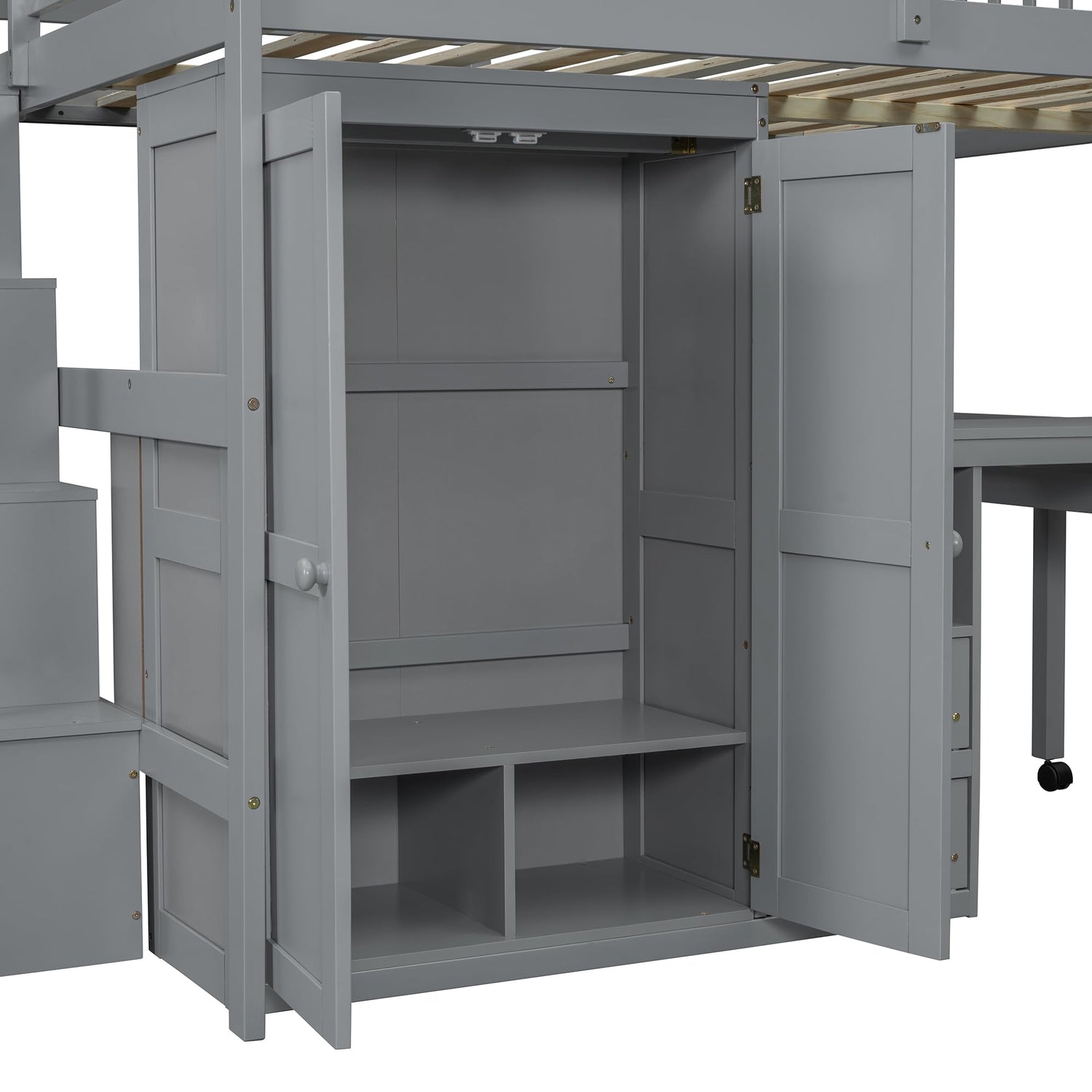 Full Size Wood Loft Bed with Desk,Wardrobe and Stairs, Bookshelf and Drawers,for Kids Teens Adults Bedroom Use (Gray#X, Full)
