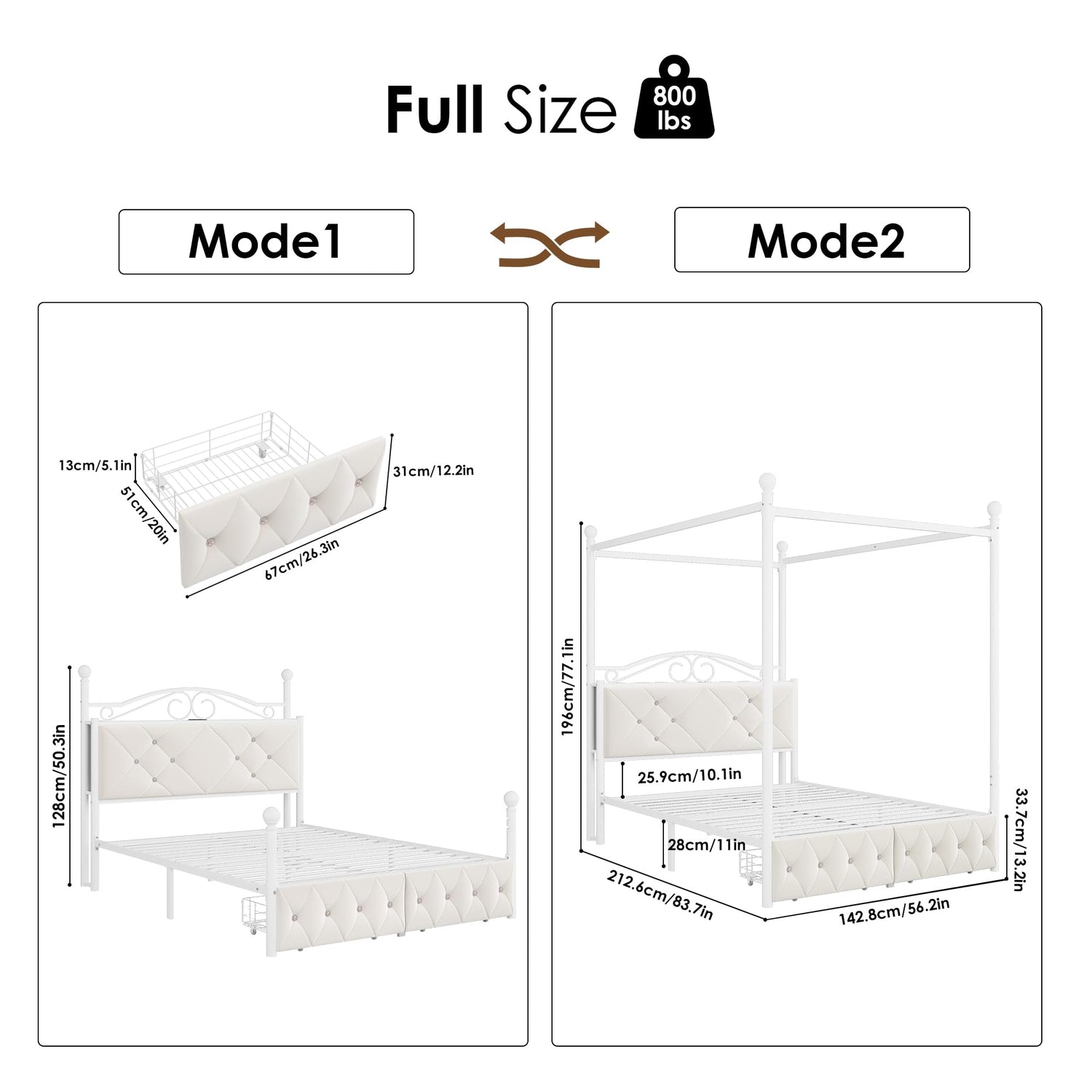 Full Upholstered Canopy Bed Frame with 2 Drawers & Crystal Tufted Storage Headboard Metal Platform Bed with Charging Station & 4 Removable Posts No Box Spring Needed Curtain Not Included, Beige