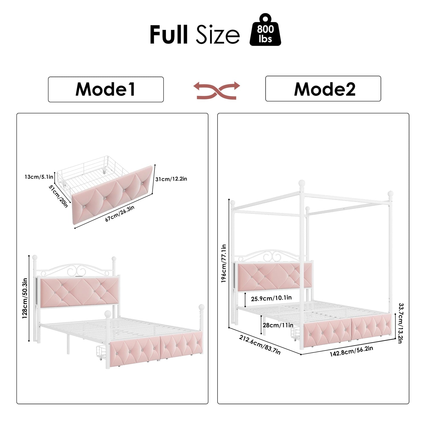 Full Upholstered Canopy Bed Frame with 2 Drawers & Crystal Tufted Storage Headboard Two-Purpose Metal Platform Bed with 4 Removable Posts & Charging Station Pink Princess Bed, Curtain Not Included