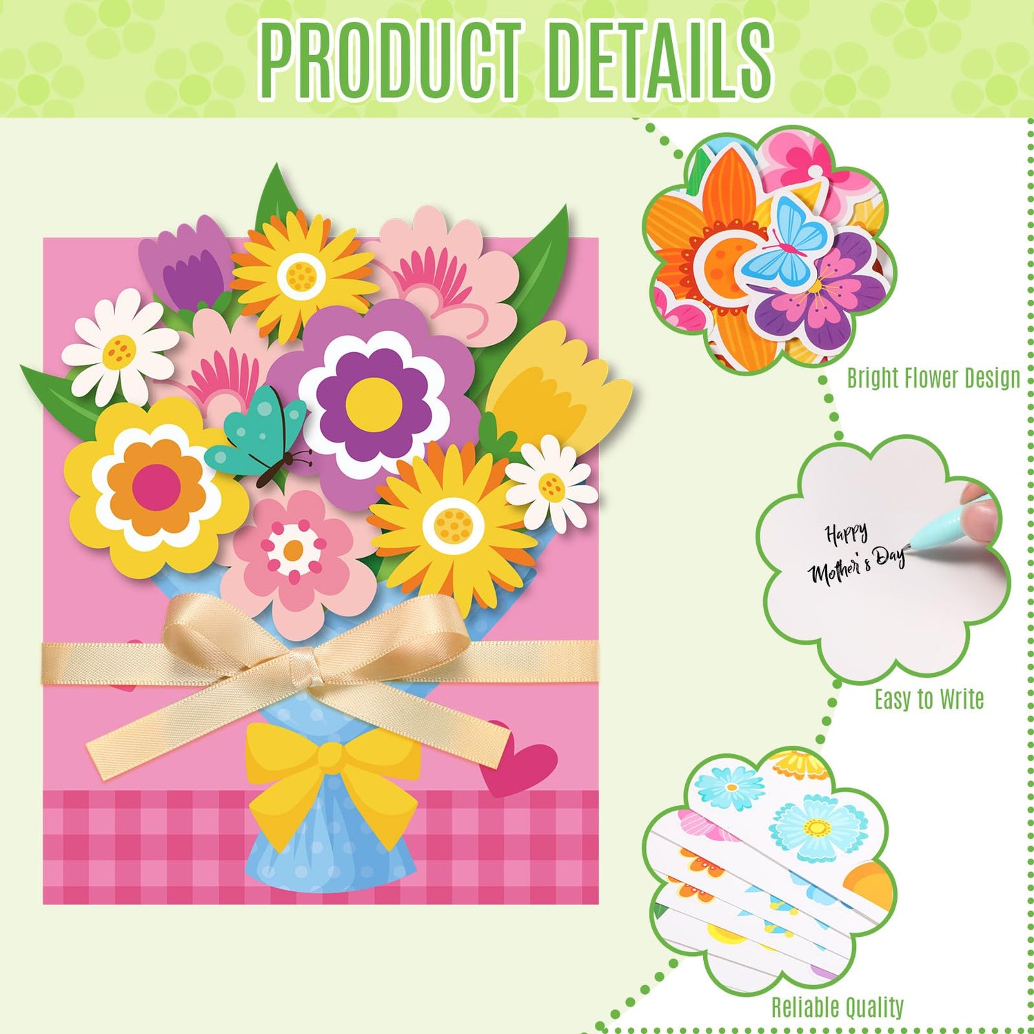 - Mother's Day Card Kit: experience a fun-filled DIY activity with our comprehensive DIY Mother's Day card craft; This set gives you 30 cards, 30 envelopes, 30 gold bows, 210g DIY flowers and 4 sheets of double-sided tape (25 strips each); With a variety of styles and colors, this set is an ideal tool for making Mother's Day gifts