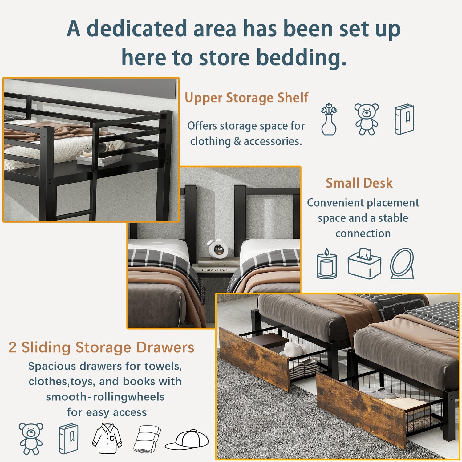 • 🙌Smart Storage Solutions🙌This triple bunk bed includes a steel shelf beside the upper bunk for storing clothes or accessories. The space between the lower bunks features a small desk, offering a convenient spot for study or play while maximizing storage options. The two pull -out drawers under the lower bed saves you space toys that store clothes and items. Drawer includes 4 easy-glide casters, is easy to pull out.