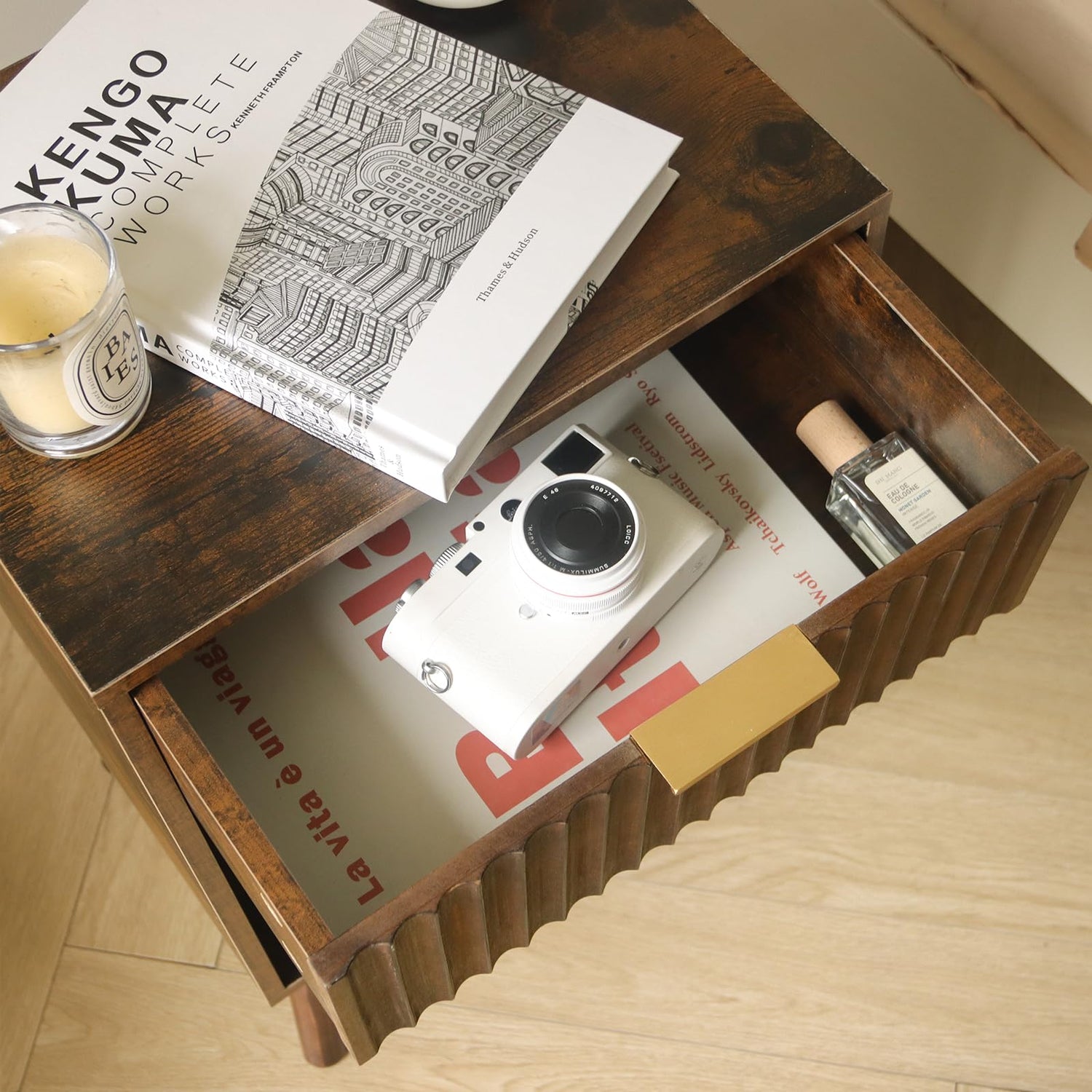 - Chic Fluted Nightstand: The charming walnut grain, smooth surface, metal handle, and curved drawer create this mid century modern nightstand. The fluted drawer is corrugated, which makes this wood bedside table more unique and stylish, while the metal drawer handle matches natural legs, and exudes a vibe of elegance