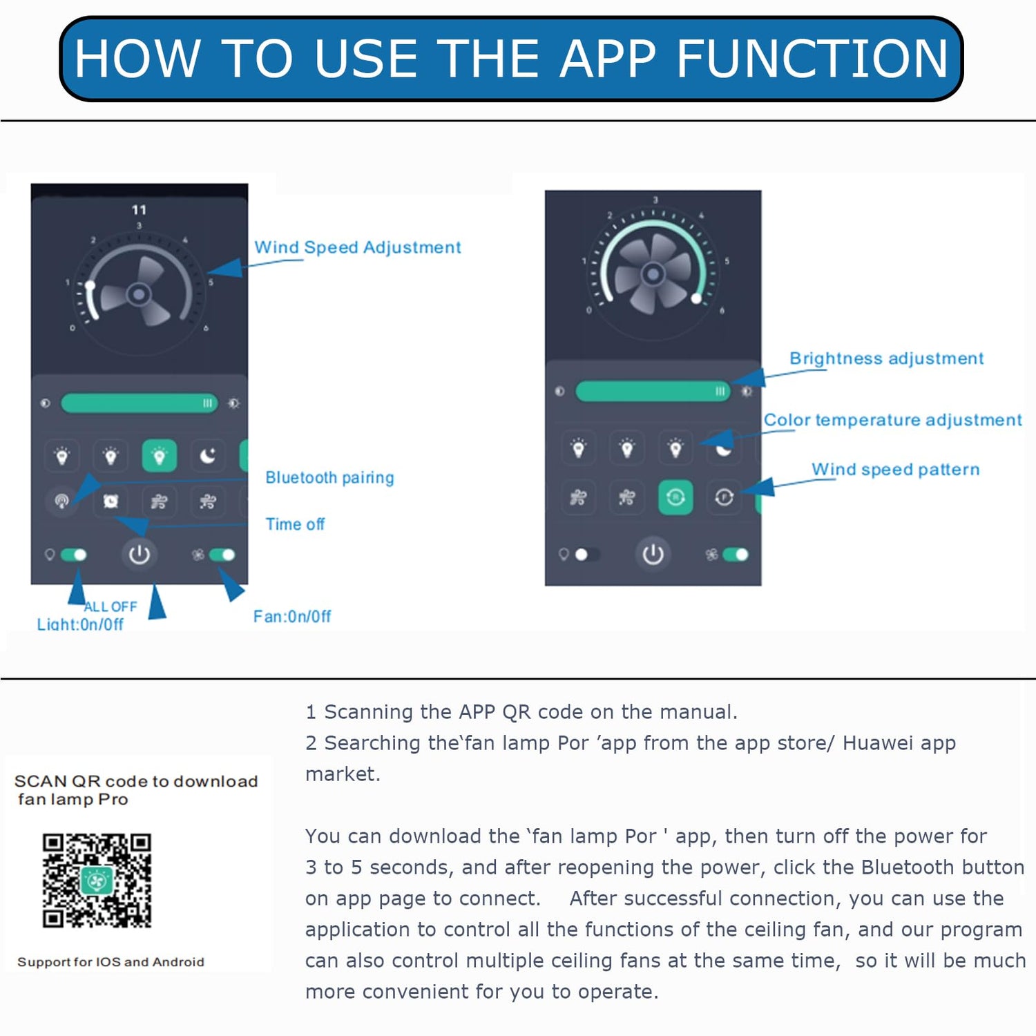 - [Ceiling Fan with Remote/APP Control] Control the ceiling fan light via the remote control or the "fan lamp pro" app on your phone. Easily adjust light brightness and color, 6-speed settings, 1/2/4H timers and the fan and light separately ON/OFF, allowing you to easily adjust settings from anywhere in the room or outdoor places for optimal comfort. (Tips: After fixed, the remote control can be used as a wall switch)