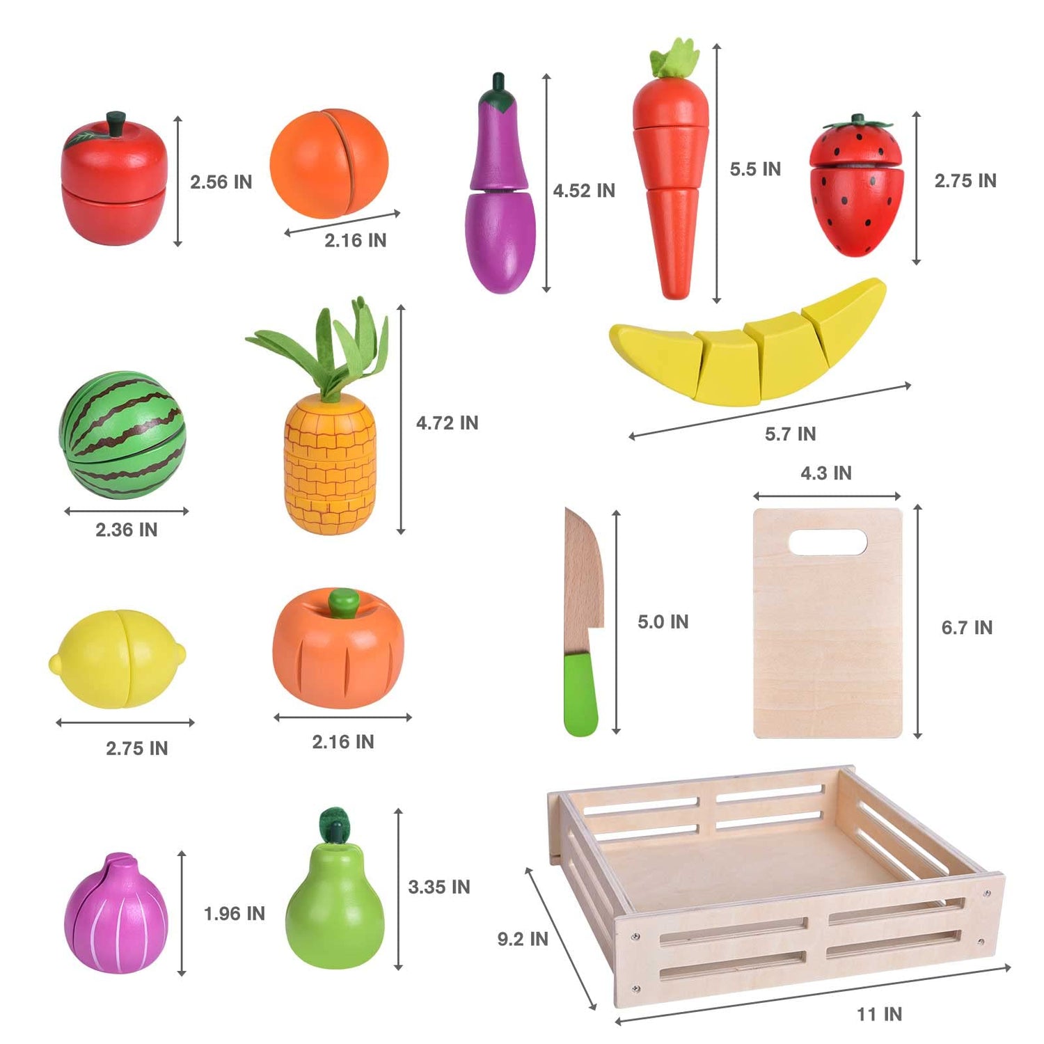 - Fruit and Veggie Grocery Store: including 1 storage box with various fruit and veggie toys, 2 toy cutting knives, 2 toy cutting boards, and 12 foods. The hollow design of the basket enables it to store many toy fruits and veggies, so you should never worry about messing the toys. The size of the box is 11*9.2*2.5 inches.