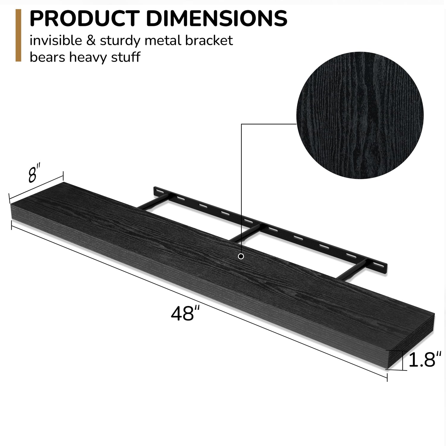 - Extra Deeper & Thicker - Each board measures 48"W x 8"D x 1.8"H. Extra deeper and thicker design in order to bring maximizes storage space and weight capacity, even hold up to 75 lb each. This floating shelf taking up zero square feet, reduces clutter and highlights décor in compact spaces.