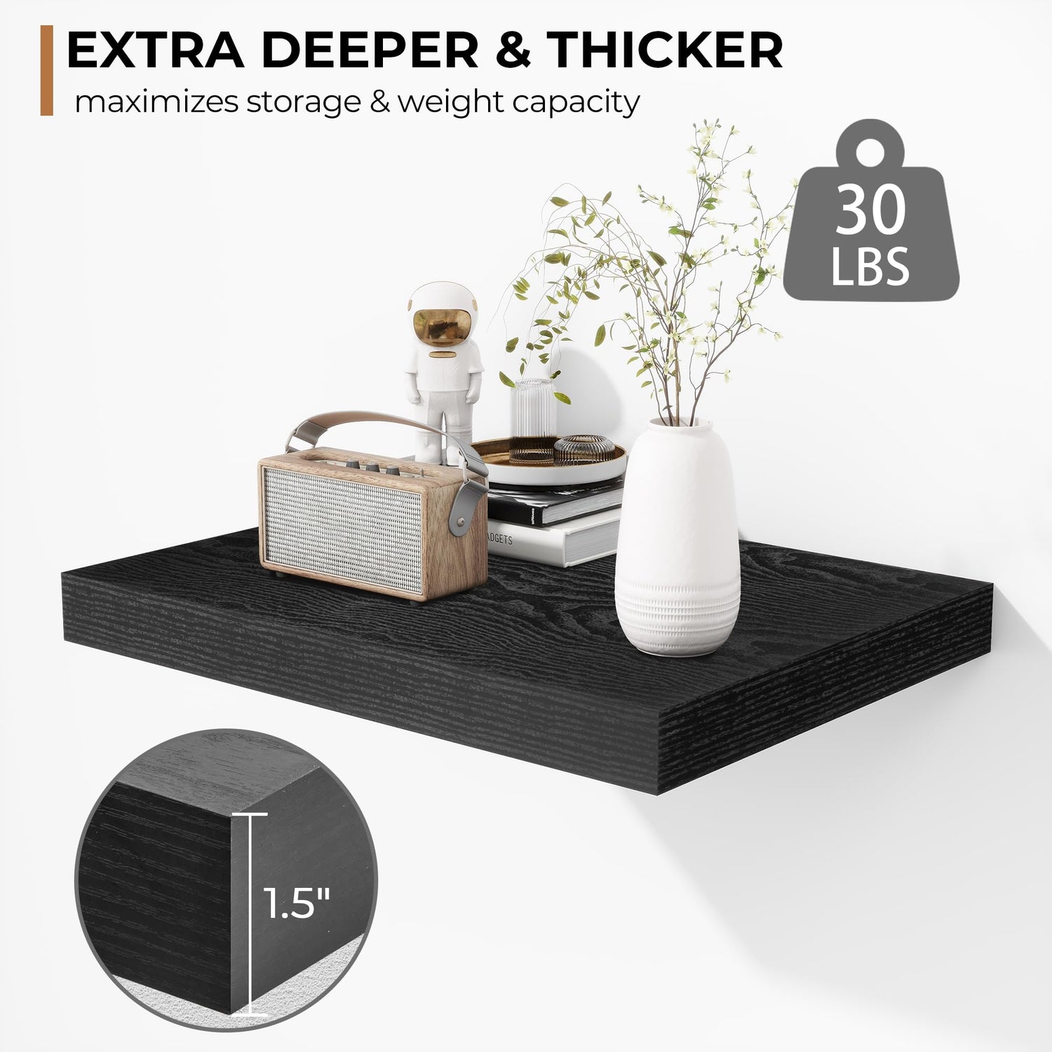 - Extra Deeper & Thicker - Each board measures 16"W x 12"D x 1.5"H. Extra deeper and thicker design in order to bring maximizes storage space and weight capacity, even hold up to 30 lb each. This floating shelf taking up zero square feet, reduces clutter and highlights décor in compact spaces.