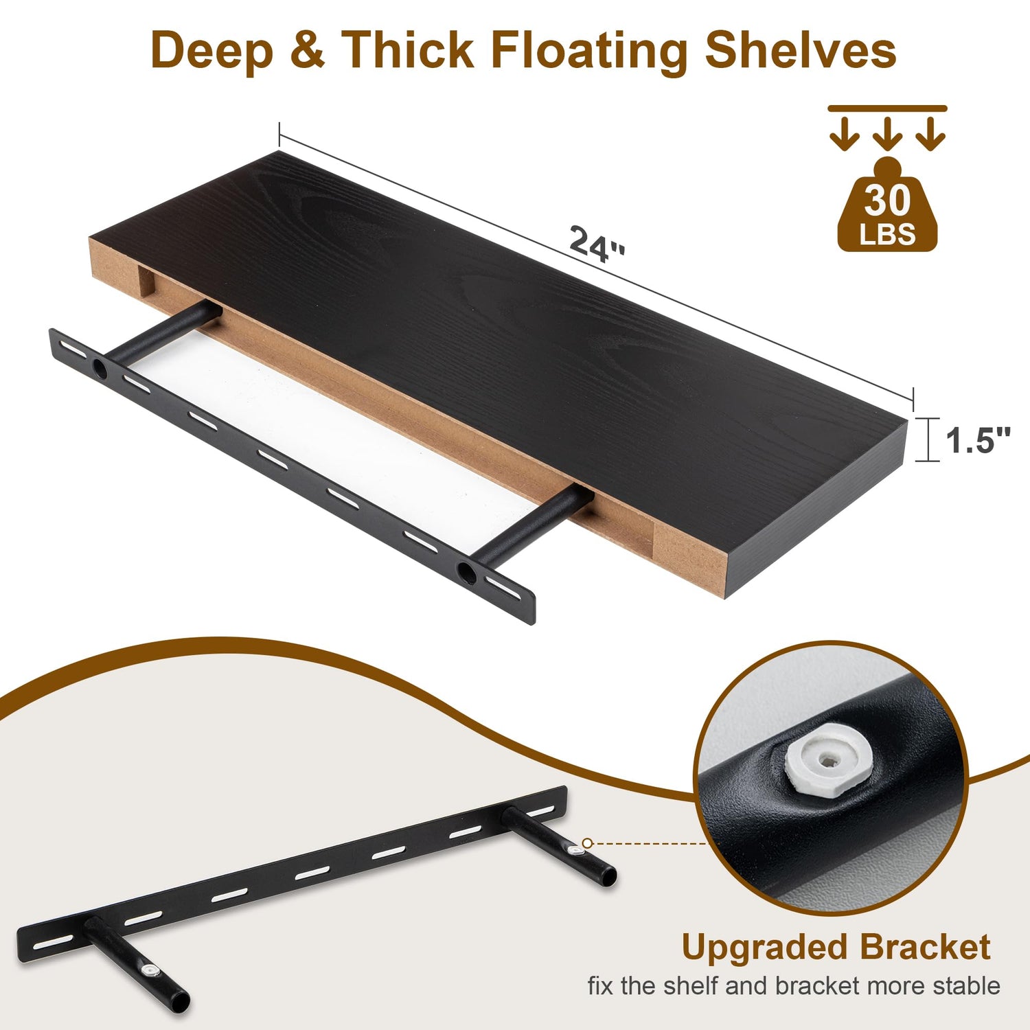 Fun Memories Floating Shelves for Wall, 24Inch Floating Shelves Set of 2, Hanging Shelf with Invisible Brackets, Wood Shelves for Living Room, Bedroom, Kitchen, Black
