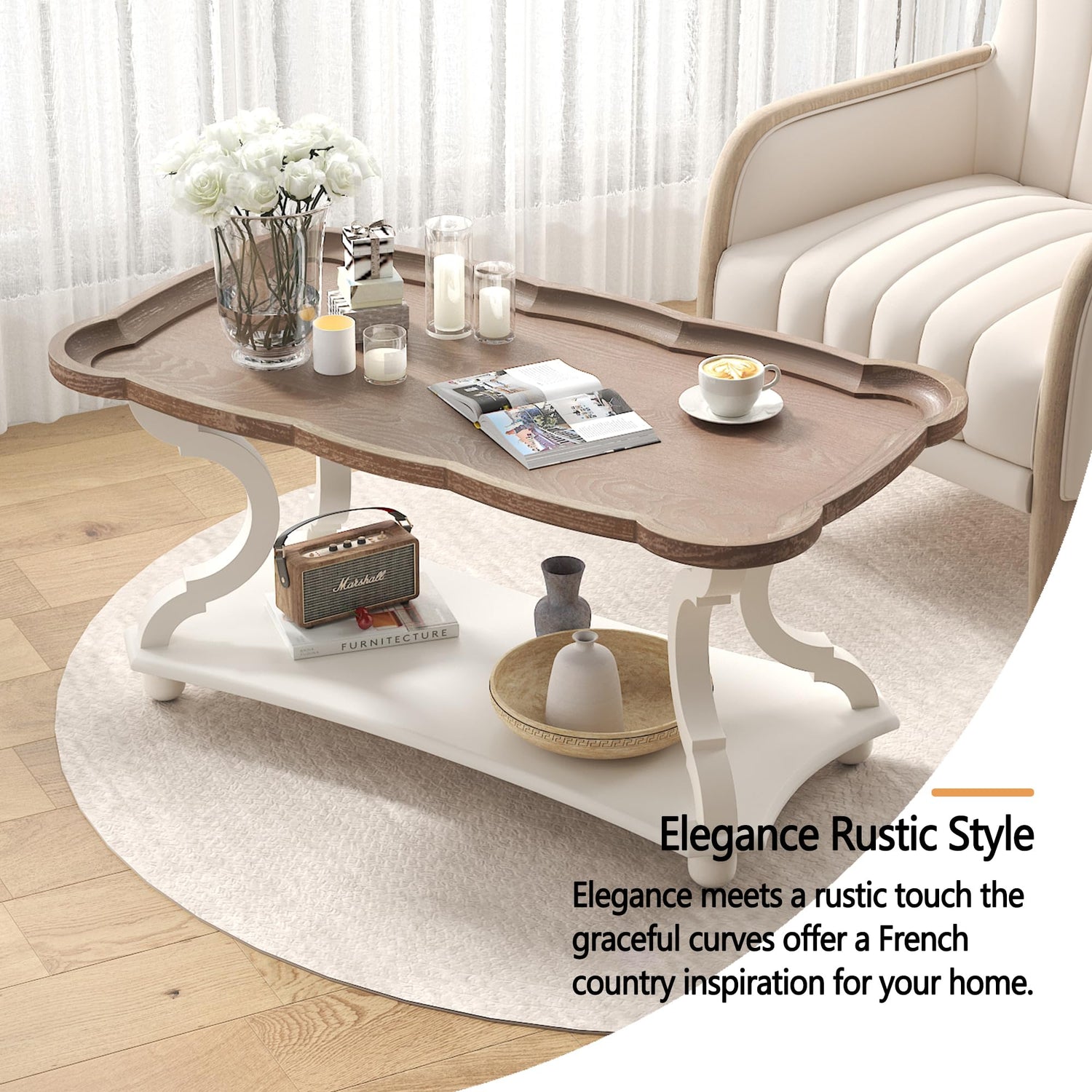 - 【Farmhouse Coffee Table】Bring your room a touch of elegance and romantic French country charm with this vintage white coffee table. The coffee table features a natural wood tray-style finish that perfectly complements its sturdy base, making it ideal for any decor style from rustic to traditional.