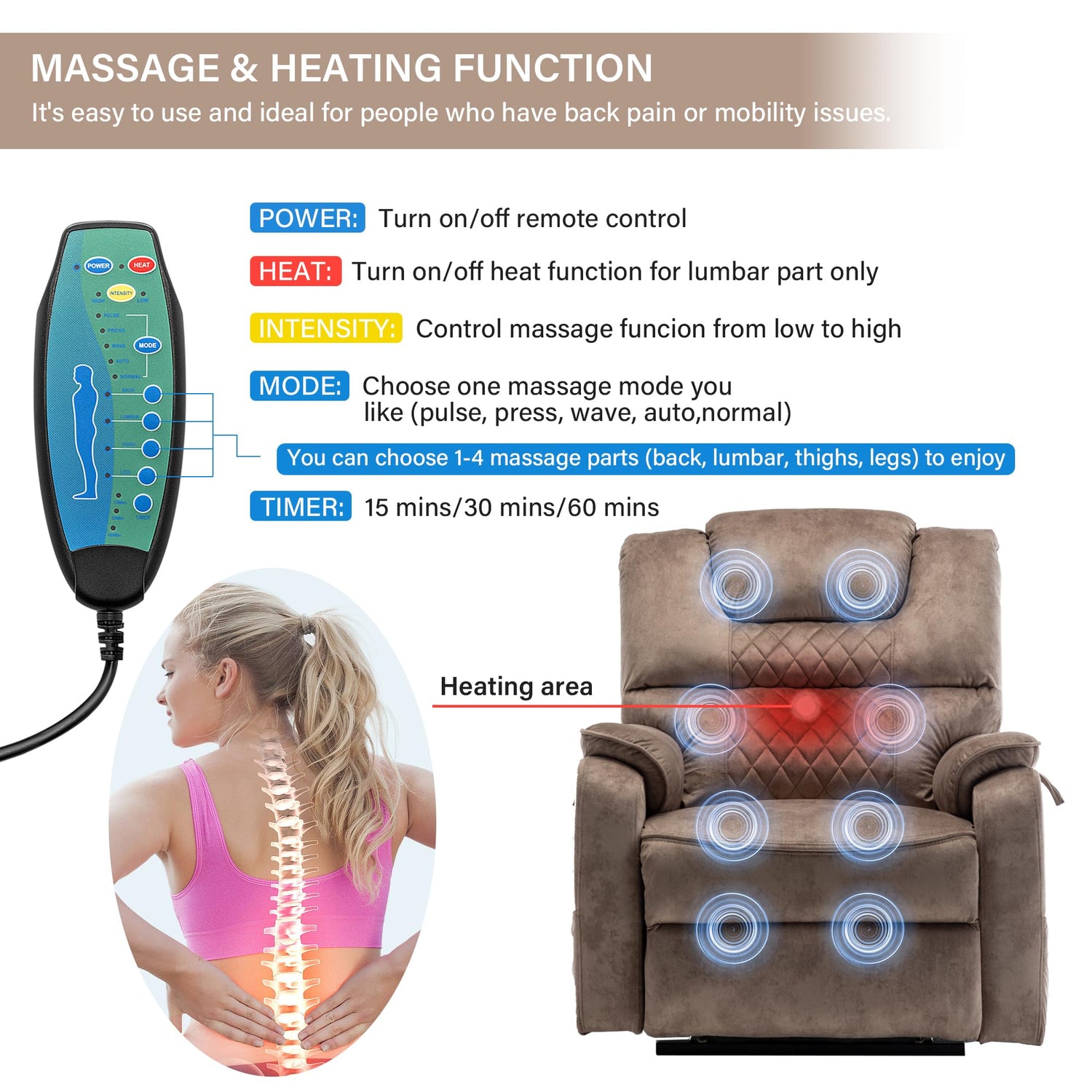 - 【DUAL OKIN MOTOR】With dual OKIN motor,the backrest and footrest of this power recliner can be adjusted individually.The chair helps seniors to stand up with a 4-button hand controller and be stable and safe in use.Conforming to ergonomic principles,the massage recliner chair's high density sponge supports your neck,arm,back,and legs.It's ideal for people who have back pain or mobility issues.