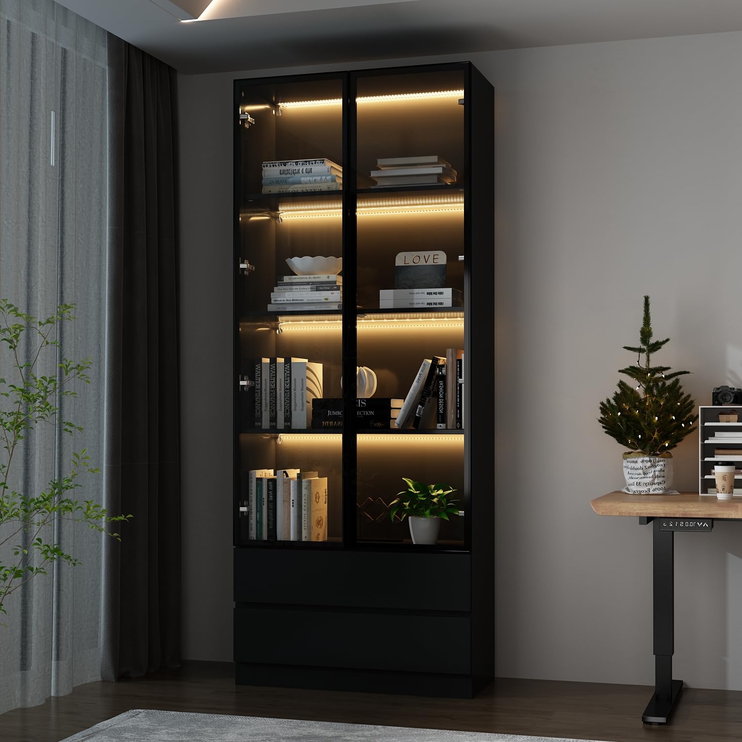 Details: FUNISIR Curio Display Cabinet with Light, Storage Shelves with Pop-up Glass Doors, 2 Drawers & 3 Color Light, Collectibles Cabinet Display Shelf, Bookshelf Showcase for Living Room, Black w/ Drawer