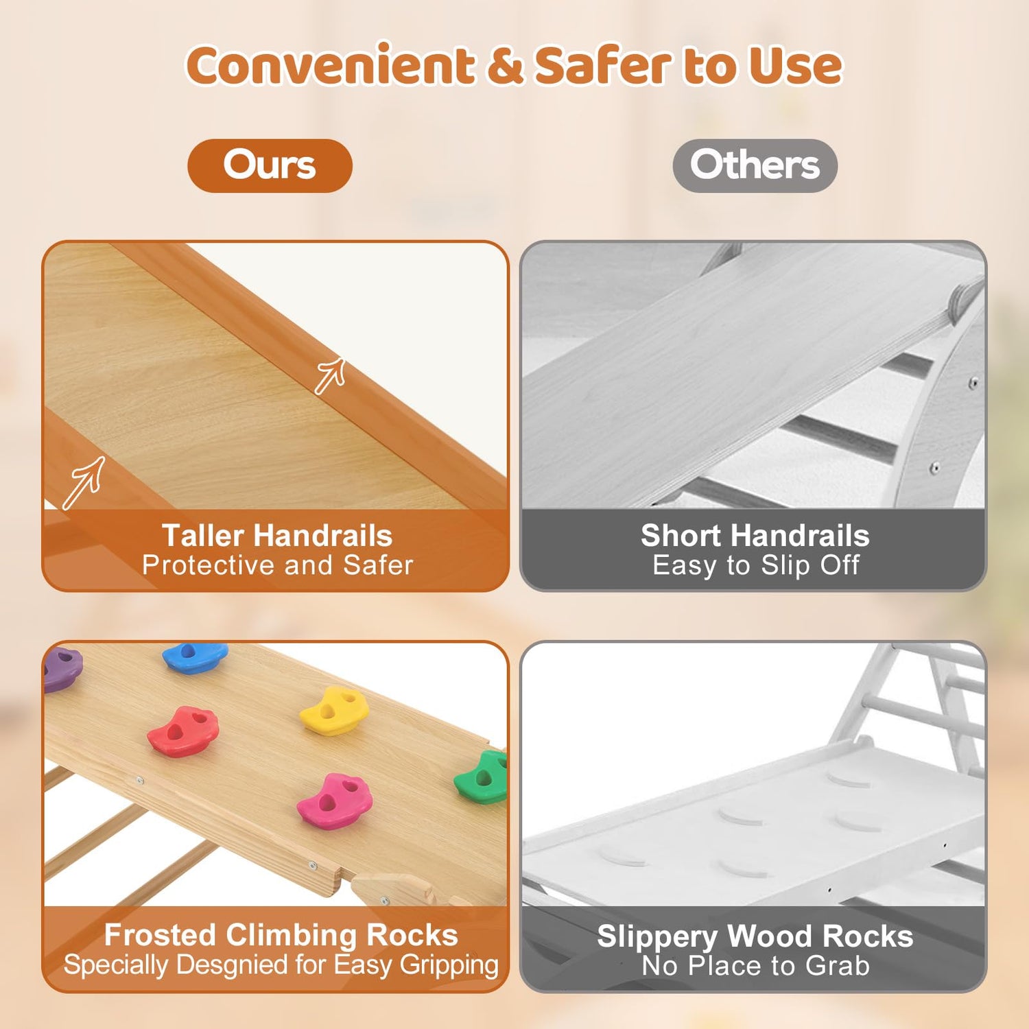 - 【Upgraded Safety Details, Ensure Safe Play】We pay attention to every safety detail. On the slide, we have increased the height of the protective handrails for safer sliding. The frosted climbing rocks have been specially designed to be easier to grip. To make the climbing poles work with the climbing set, specially designed half-moon grooves are provided to prevent sliding or falling off.
