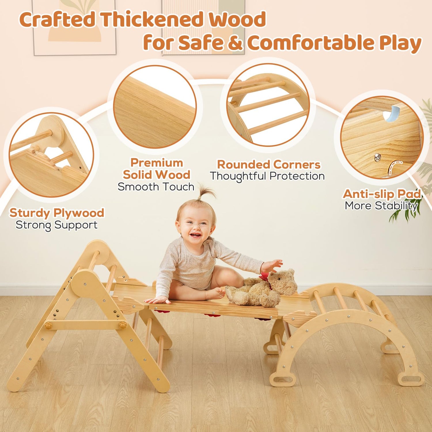 FUNLIO Foldable Pikler Triangle Set, Montessori Climbing Set with Solid Wood for Toddlers 2-5 yrs, Adjustable 5-in-1 Indoor Play Gym with Arch/Slide/Climbing Rock/Triangle, Easy to Install-Medium Size