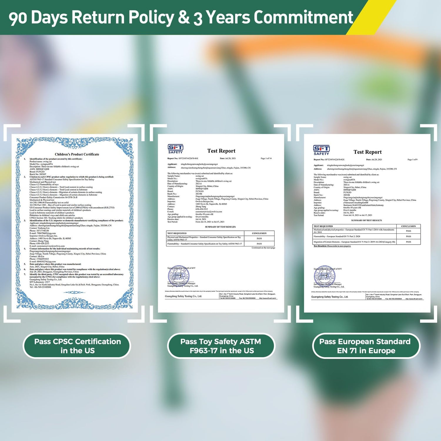 - 【90 Days Money Back & 3 Years Warranty】FUNLIO swing stand has passed CPSC and ASTM in the US, European Standard EN 71 in the EU. Safety is very important when children play. We promise to do everything we can to make sure that you or your loved ones are 100% satisfied with your purchase. If for any reason you're not satisfied with your purchase, we provide you with a 90-Day-Money-Back Guarantee & 3-Year Warranty.