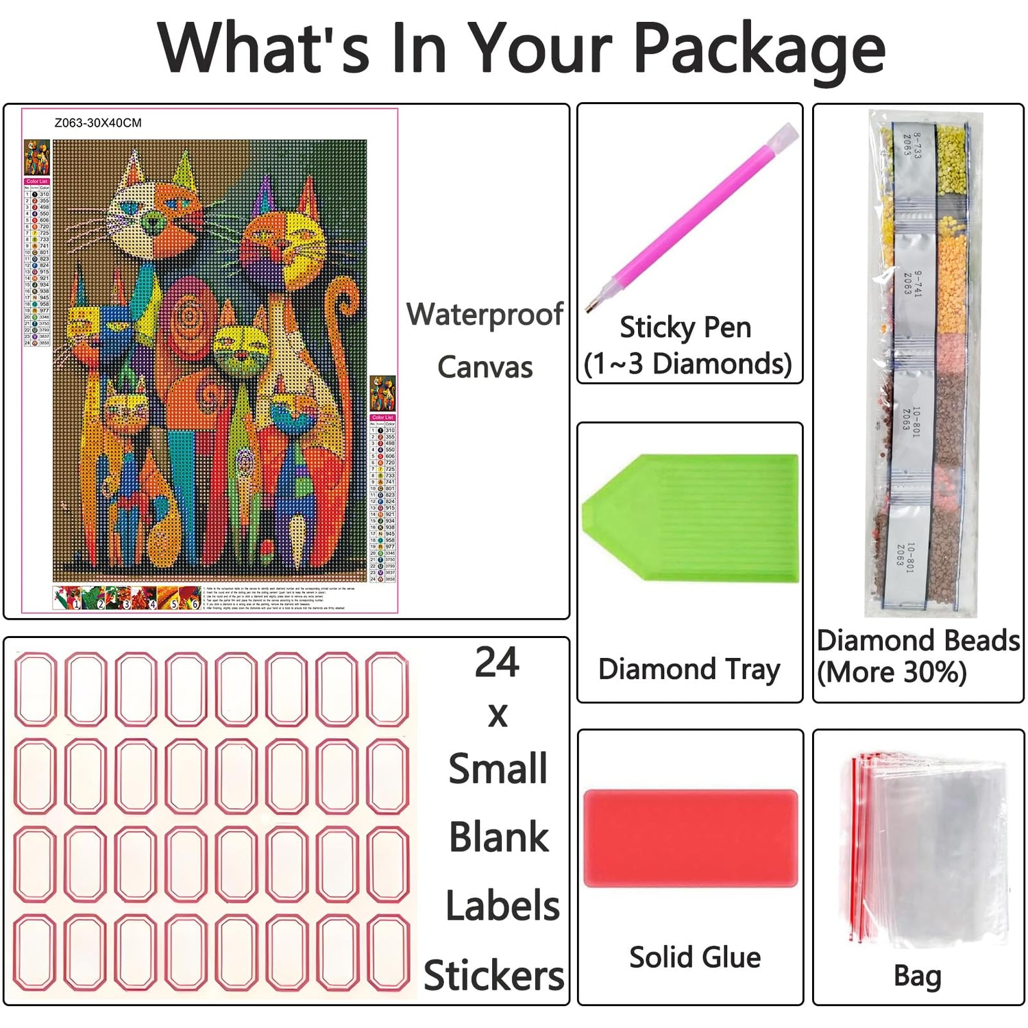 - Abstract Cat Diamond Art Kit Include: 1 × HD diamond canvas(11.8x15.7inch); 1 x set of individually wrapped diamonds(about 30% extra beads in every color); 1 × diamond pen; 1 x solid glue; 1 x grooved organization tray; 5 x self-sealing bags; 24 x small blank labels stickers. Shouruihua comes with all of the necessary items to help you finish the diamond art