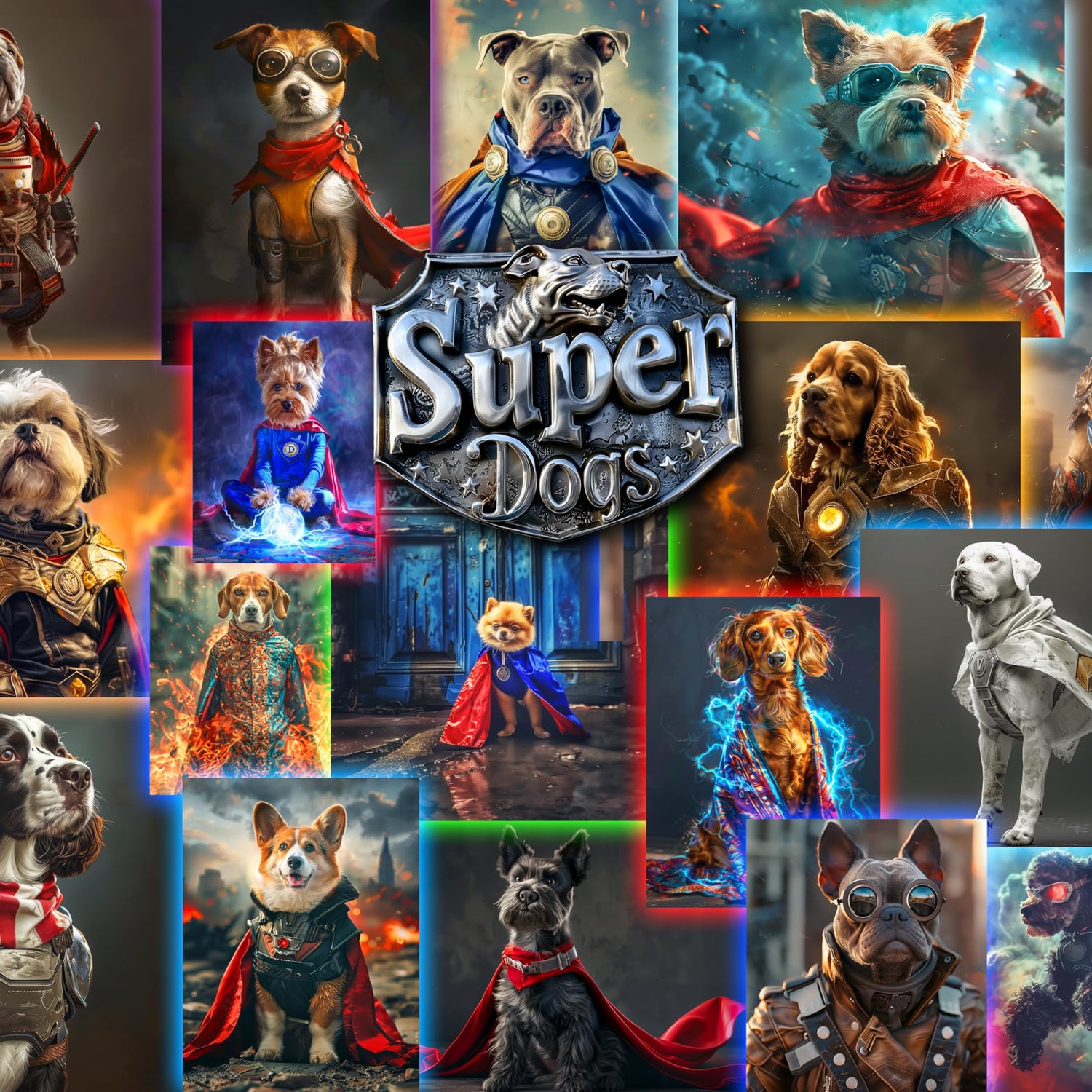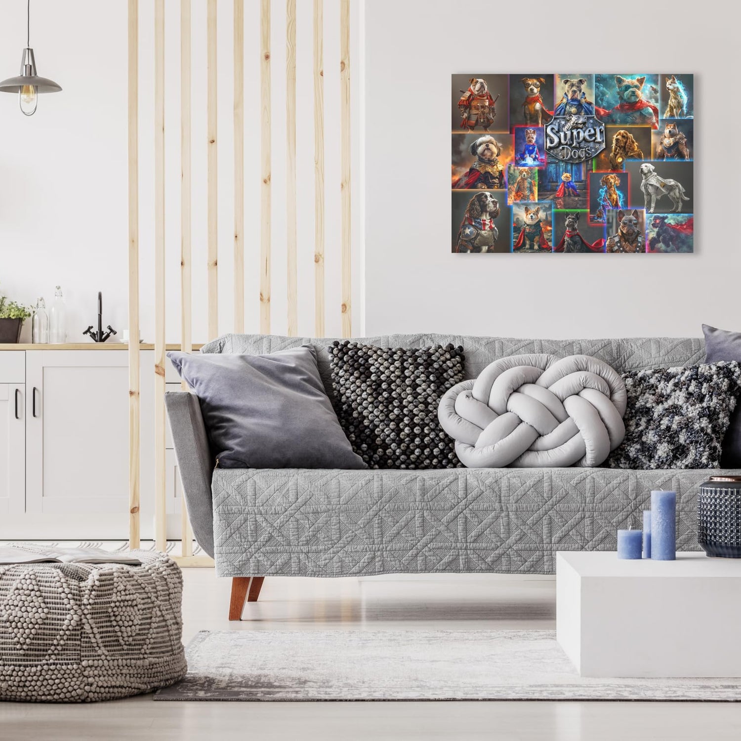- COMPELLING AND FRAME WORTHY ARTWORK - A dynamic scene of super hero dogs—Boxer, English Bulldog, Beagle, Shih Tzu, Labrador, Poodle, Springer Spaniel, Scottie, Pomeranian, Husky, Corgi, French Bulldog, Terrier, Yorkie, Dachshund, and Akita—each showcasing their unique powers in action-packed costumes.