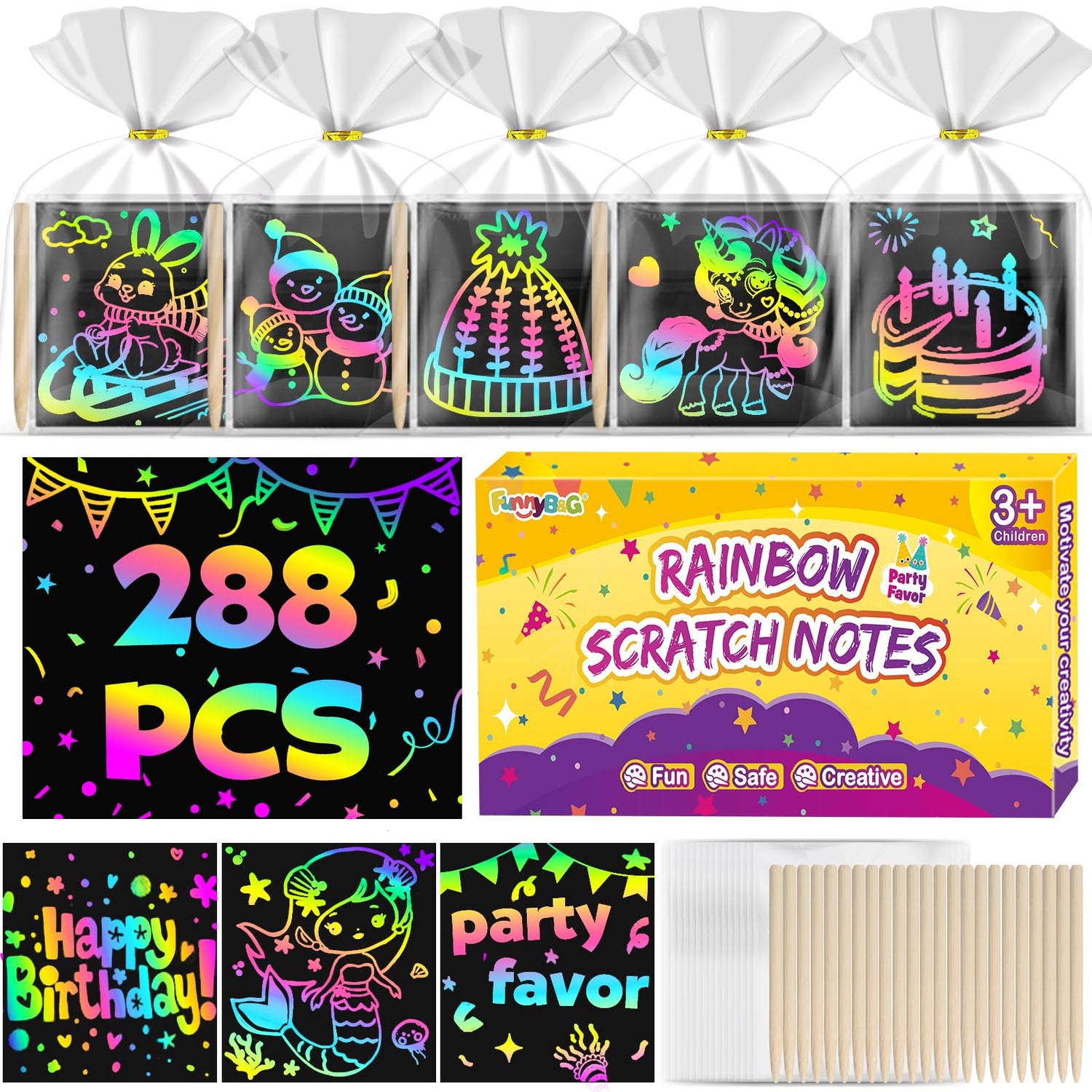 FUNNYB&G Rainbow Scratch Art Party Favors for Kids:288 PCS Scratch Paper Art Craft Kit Girls Boys Back To School Gifts for Kids Students Bulk Birthday Classroom Prizes Goodie Bags Stuffers Mini Notes