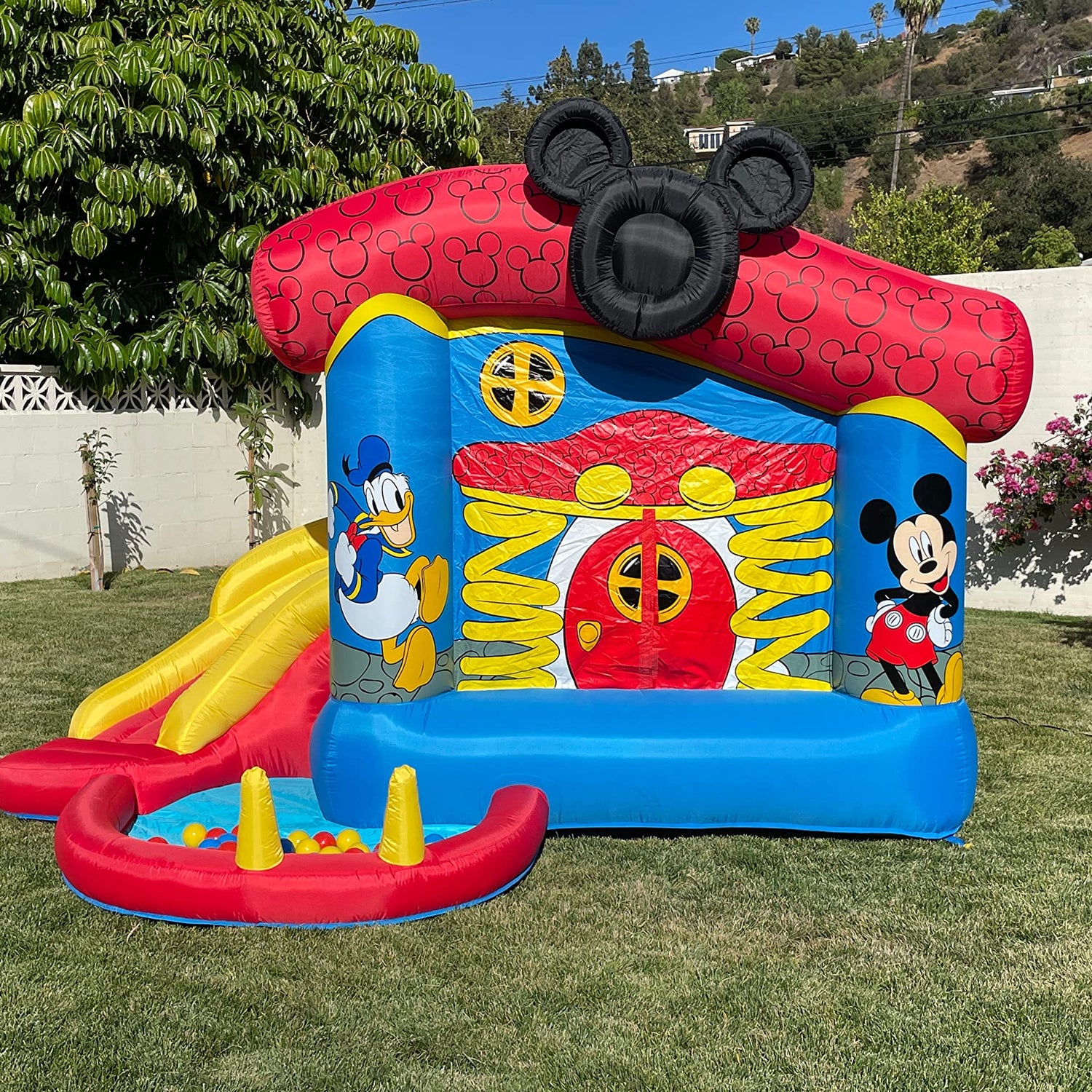 Funormous Disney Mickey Mouse Bounce House with Slide, Indoor Outdoor Inflatable Bouncy Castle Funhouse Ball Pit Plus Heavy Duty Air Blower