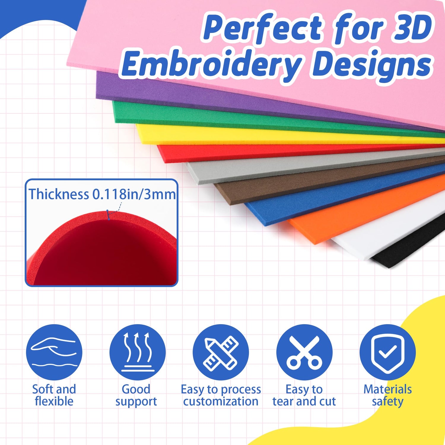 - 3D Embroidery Foam: 24pcs, 6 "x 9", 3mm thick EVA foam. Made of highly elastic material that withstands machine washing while maintaining long-lasting 3D fullness! Combined with dense stitching, it effortlessly creates beautiful 3D raised embroidery.