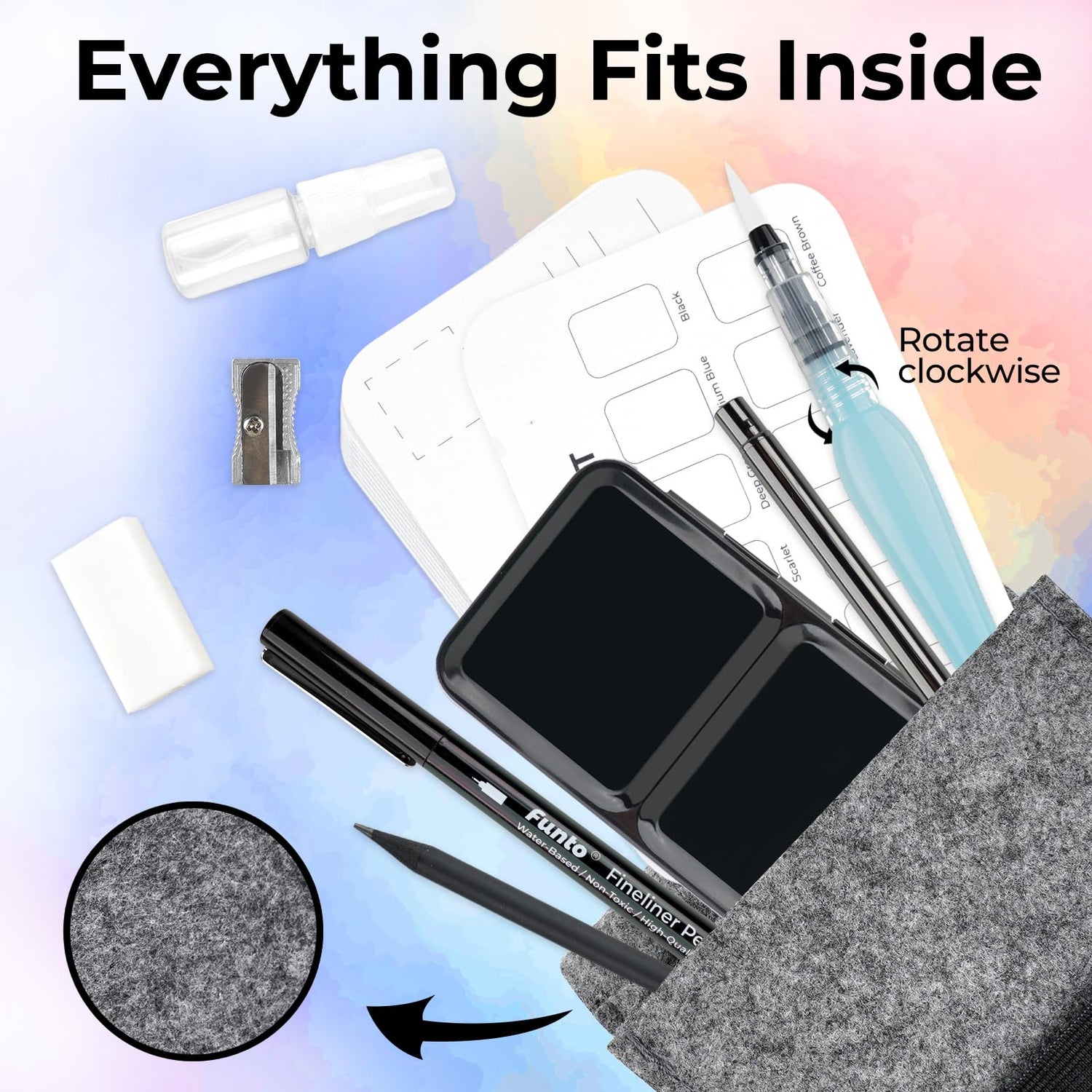 Funto Travel Watercolor Set, 12-Color Paint, 10 Premium Postcards, Brush, Brush Pen, Fineliner, Pencil, Painting Set for Adults, Beginner, and Artists